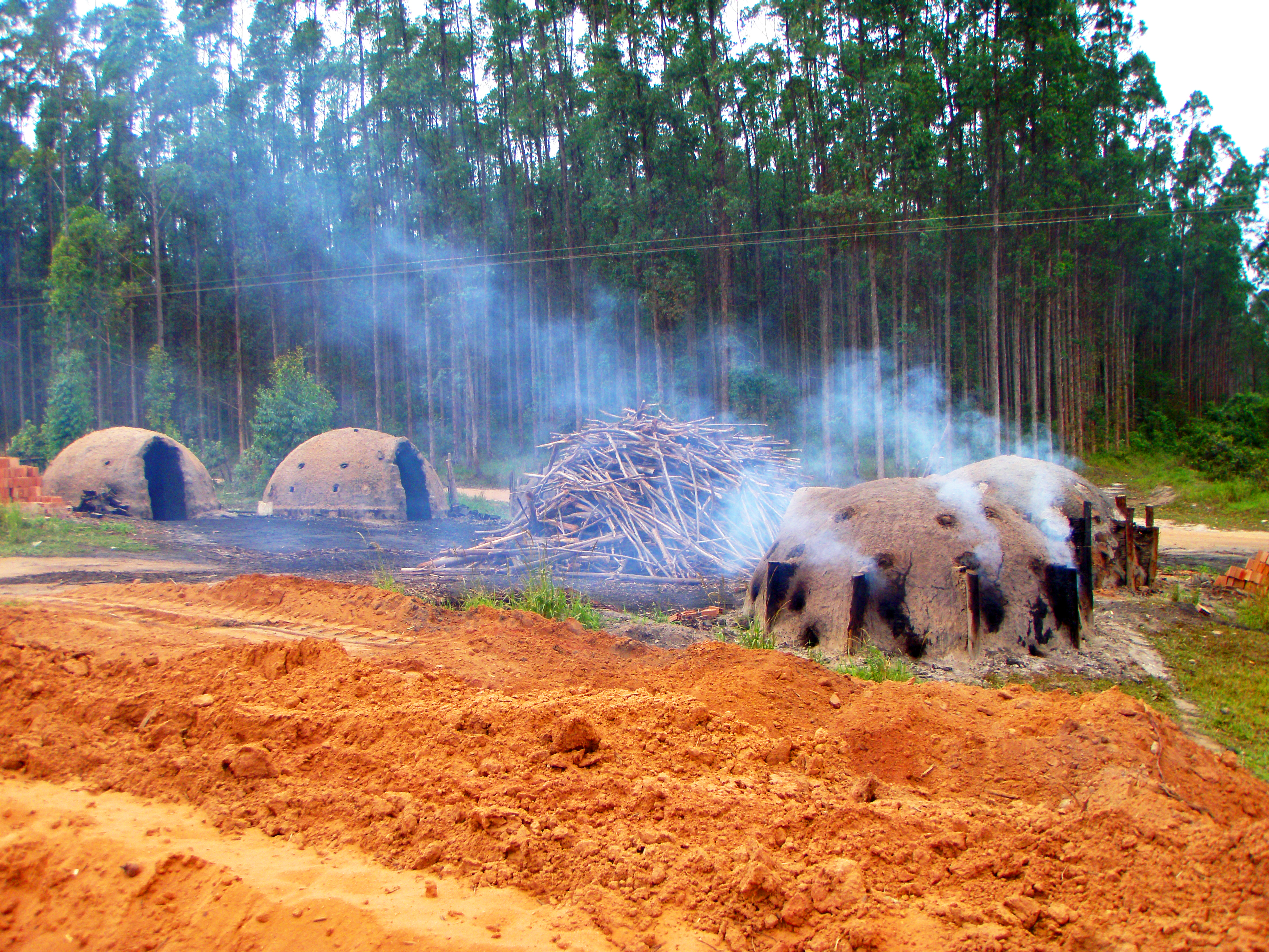 Apres presque 10 heures de sommeil, nous sommes en pleine forme pour continuer l’interminable route qui doit nous mener vers des contrées plus gracieuses. Madame GPS, fidèle au poste assume son rôle à ravir, même si, je ne sais par quel hasard du destin, nous nous retrouvons perdus dans une favela de Vitoria, grande ville de l’état de Spiriti Santo (ça ne s’invente pas). Bon après 20 minutes de « calculs en cours » la belle nous remet sur le bon chemin. Nous choisissons « un mignon petit village de pêcheurs…. » comme point de chute. Caravelas. Oups, pour y aller, nous avons droit à 90 kms de pistes. Mais de la vraie piste, du sable rouge, des trous, tout quoi, une vraie piste. Entourée de forêts de part et d’autre, la piste nous a cependant permis d’admirer un artisanat ancestral et très photogénique. La fabrication de charbon de bois dans des sortes d’igloos façonnés en terre. C’est super beau.