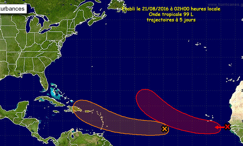 Très important en cette période de ne pas oublier de jeter, de temps en temps, un petit coup d’oeil sur la météo. Attention, pas de scénarios catastrophes avant que cela ne soit nécessaire. J’ai vu sur le net ce pauvre Gaston (qui n’est pas encore né à l’heure qu’il est) menacer notre partie du globe des pires catastrophes. On se calme, pour l’instant, Gaston n’existe pas en tant que tel, ce n’est qu’une onde tropicale, c’est à dire un amas nuageux assez bien formé qui, à l’heure où je vous « parle » n’a que 30% de chance de se transformer en quelque chose de plus méchant (trajectoire orange sur le cliché). Il est cependant suivi de près par une autre vilaine chose qui elle, a 50% de chance de nous perturber (trajectoire rouge). Rappelons que l’une des conditions pour que ces perturbations prennent de l’ampleur et nous pourrissent la vie est la température de l’océan, au moins 26 degré sur une profondeur de 50m. Bon, c’est vrai, l’eau est très chaude en ce moment, alors on croise les doigts, on n’oublie pas de regarder les petits monstres dans les yeux, histyoire de les effrayer un peu et on reste serein. Beau dimanche à tous.