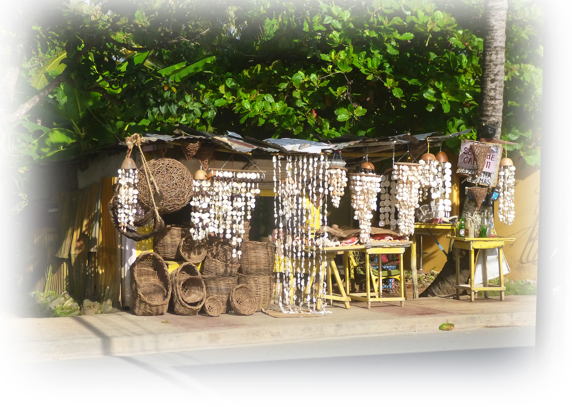Ca ne vous aura pas échappé, Noel approche à grands pas. Le village a revêtu ses habits d’apparat et les boutiques, de la plus petite à la plus prestigieuse, rivalisent d’audace pour être la plus belle, la plus originale, la plus exquise. Histoire de voir toutes les merveilles que les commerçants de Las Terrenas, dominicains ou étrangers vous réservent pour des fêtes merveilleuses, le meilleur moyen est d’abandonner autos ou quads pétaradants et de déambuler à pieds dans les rues du village. Mais attention, on ne parle pas de marathon, il faut y aller tout en douceur, en câlin, en prenant le temps de flâner nonchalamment, oser pousser des portes et regarder, toucher, sentir les mille objets qui s’offrent à vous. C’est le moment ou jamais de faire ou refaire connaissance avec ce délicieux village du bout du monde aussi surprenant qu’accueillant. Allez, c’est parti pour une longue flânerie, à la recherche du bonheur. Ne cherchez pas de logique dans mon parcours, il se peut que je vous fasse revenir sur vos pas, que l’on saute du coq à l’âne, de vêtements de princesse à des tableaux de rue, de paniers en osiers à des sacs so chic, d’une escapade en Inde à un artisanat haîtien, de savons si délicats à des rideaux de coquillage….. Mais, si vous me suivez dans ma douce folie, au fil des jolies images chipées par Mimi, vous ne serez pas déçus du voyage, ça c’est promis.