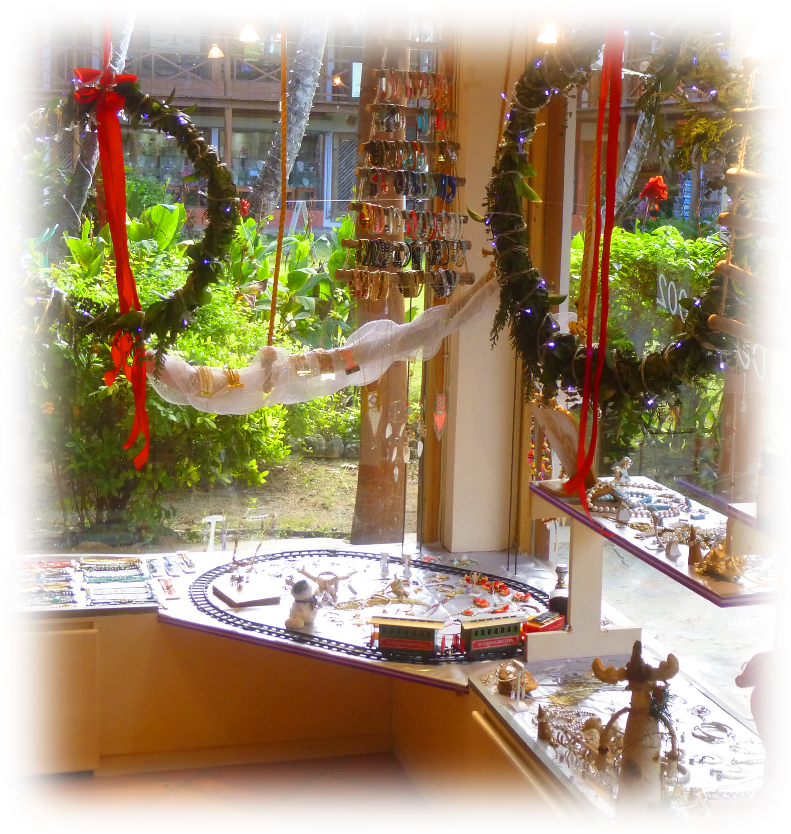 Des pères Noel-bonhommes de neige rivalisant d’ingéniosité surgissent comme par miracle. Le beau bateau en est tout surpris et j’adore celui du Paseo qui a su recycler des gobelets en plastiques pour couvrir son joli bidon tout rond. Les plus belles boutiques ne sont pas en reste et, cette année encore, je craque pour le délicieux décor tout en poésie et en féérie de Terrenas en plata. Nostalgie du petit train de notre enfance, clin d’oeil de l’hélico posé au milieu des délicats bijoux en larimar, drôle de Père Noel aux drôles de guiboles toutes frêles, trois potes sur leur perchoir souhaitant, tout joyeux, Feliz Navidad ou encore ce couple de rennes revisités, tout de blanc vétûs guetant le chaland dans la vitrine. C’est super doux, super beau, super fête, à l’image de cette boutique magique.