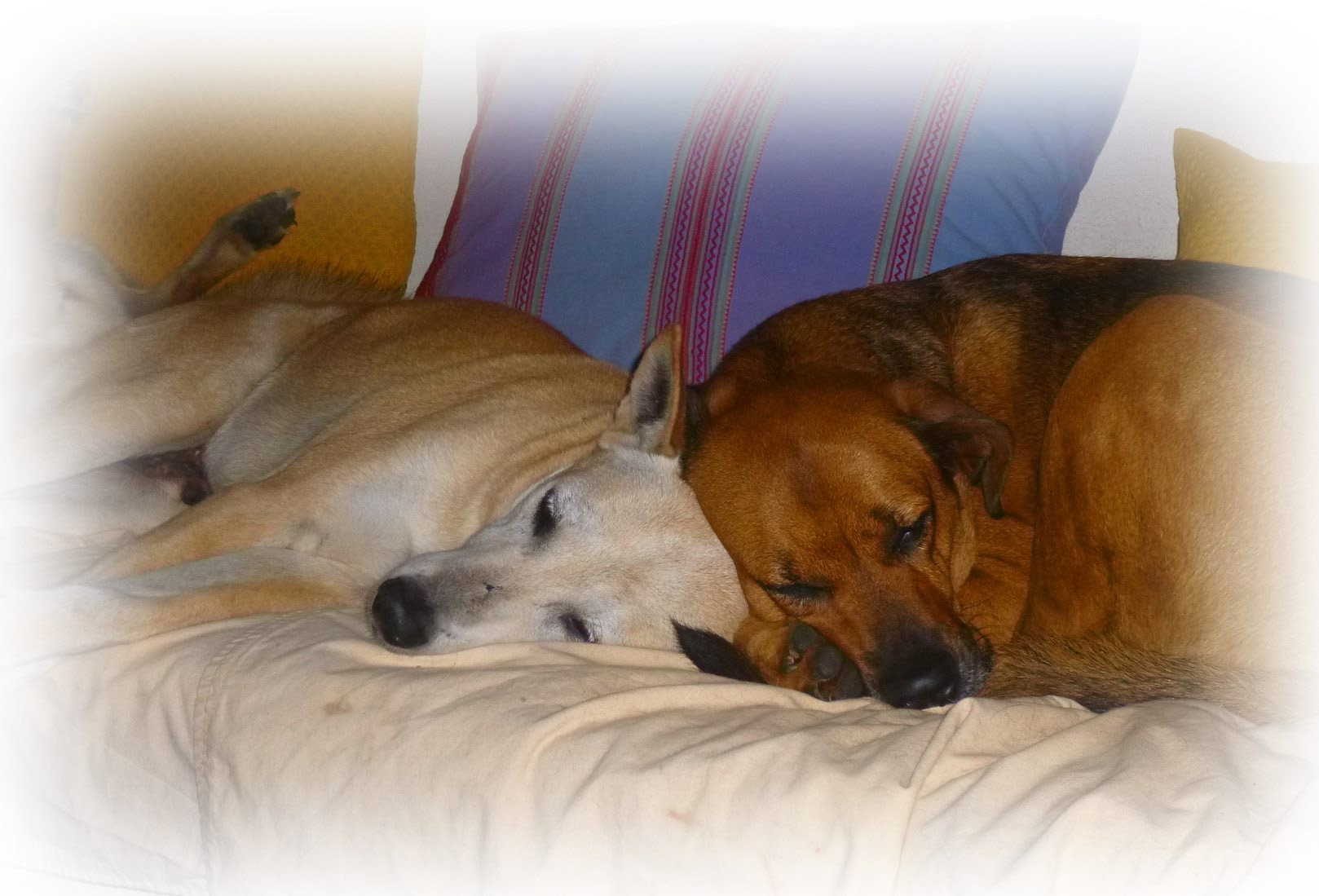 Il y a un an, je publiais ce petit message d’amour pour mes toutous. Depuis, Paquita nous a quitté, brusquement, sans trop souffrir. Elle a rejoint la jolie Comanche dans le paradis des chiens gentils. Elle nous manque chaque jour. Mina a repris du poil de la bête, mais, à 14 ans depuis peu, elle commence vraiment à se fatiguer. Domingo a subi une grave opération cette année et s’en est vaillamment sorti. Diego souffre de son arrière-train, un jour ça va, l’autre moins bien, il me fait de la peine et je le couvre de câlins. Au fur et à mesure que les jours passent, j’aime de plus en plus ma petite troupe d’éclopés, ils sont toute ma vie et, oui…… les années à venir vont être douloureuses.