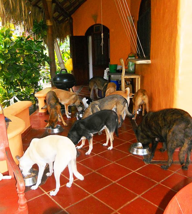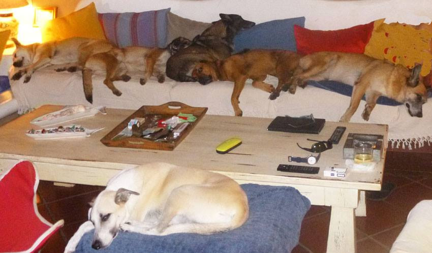 Et oui, partager sa vie avec un ou beaucoup de chiens est une source infinie de bonheur. J’ai eu et j’ai encore la chance énorme de vivre ces instants de complicité et d’amour avec ces compagnons à quatre pattes qui sont devenus mes enfants. De tout BB quand il fallait leur apprendre à faire pipi, caca dehors, à plus grand quand ils s’évertuaient à démolir systématiquement et avec beaucoup de pugnacité les jolies choses que j’aimais dans la maison. Dessus de lits et taies d’oreiller, tapis, couettes, pieds et bras de meubles gardent les vestiges de ces années turbulentes, sans compter les belles orchidées dévorées et les fils électriques sectionnés et même l’argent déposé sur une table basse et retrouvé dans les cacas le lendemain matin. Puis les affrontements. Chacun voulant imposer sa loi aux autres, les batailles, les coups de crocs, et Enrique qui, inlassablement recousait les plus abîmés. Puis les temps se font plus calmes, la petite meute se renforce, les animosités s’estompent au profit d’une vraie amitié. Des amours se créent, Diego et Coca, Tatoo et Charlie. C’est avec émerveillement que j’assiste à toutes ces évolutions, ces effusions constellées de mille léchoux. Je ne suis jamais loin d’eux, d’ailleurs, inlassablement, ils me surveillent du coin de l’œil et quand, par hasard, je m’échappe pour faire un tour au village, c’est un concert de pleurs qui n’en finit plus…. Demandez aux voisins…. Mais, les années passent inéluctablement. Les plus vieux ont 13 ans, les moyens presque 10, seuls les trois derniers n’ont que 4 et 5 ans.