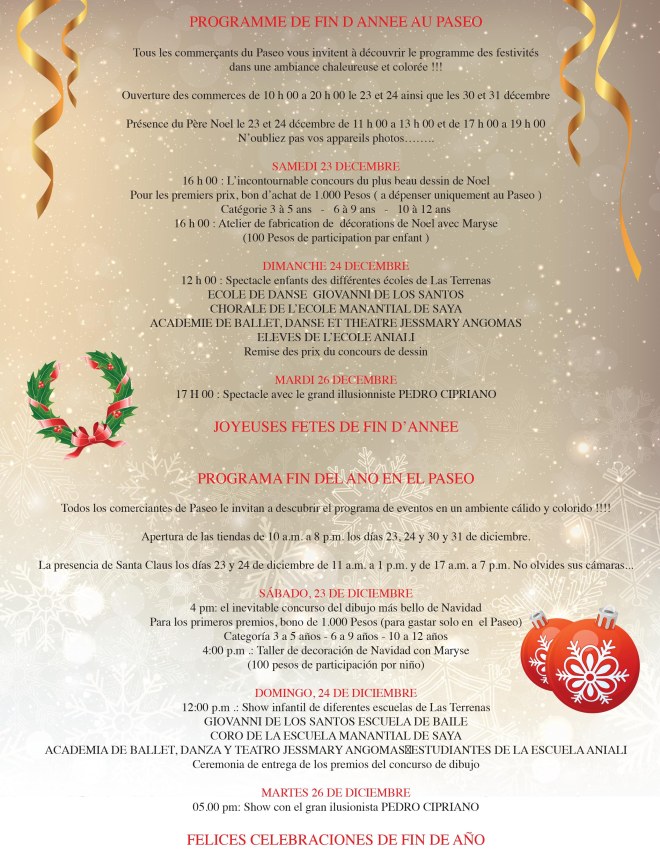 Concernant l’organisation, nous prévoyons le rendez-vous à 7h45 à la boutique (El Paseo de la Costanera – Las Terrenas). Le départ en taxi est prévu à 8h30, pour arriver à la Marina de l’hôtel The Bannister vers 9h30. De 10h00 à 11h00, nous effectuerons notre première immersion. Le temps de nous diriger vers le second site, et d’effectuer un intervalle surface intéressant, nous vous proposons une pause agrémenté de fruits et jus frais. Nous effectuerons notre seconde immersion entre 12h00 et 13h00. Une fois notre seconde expérience subaquatique terminée, nous nous dirigerons vers Cayo Levantado pour partager un repas bien mérité. Cayo Levantado est une île paradisiaque au milieu de la baie, qui mérite d’être visité. Vous disposerez de l’après midi pour profiter de la plage et des atouts de l’iles. Le départ est prévus pour 16h00, arrivée à la marina vers 16h30 pour un retour à Las Terrenas vers 17h30.