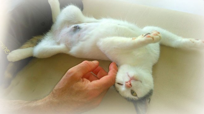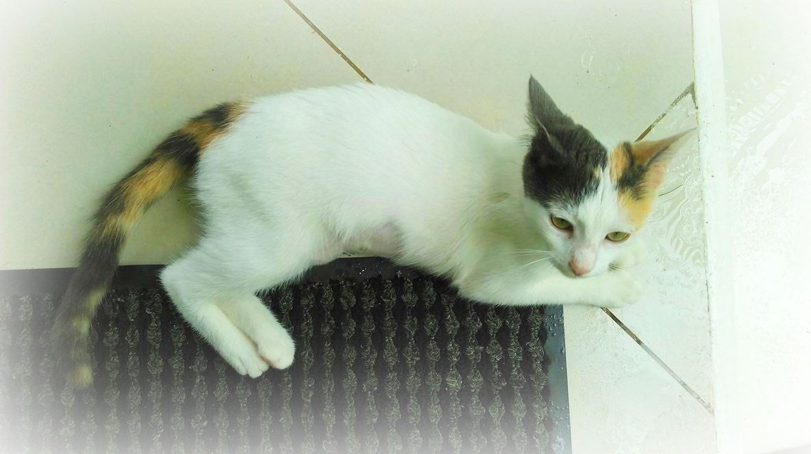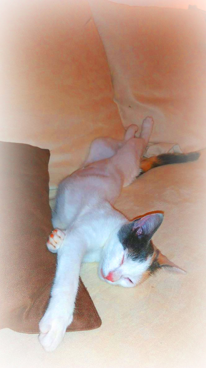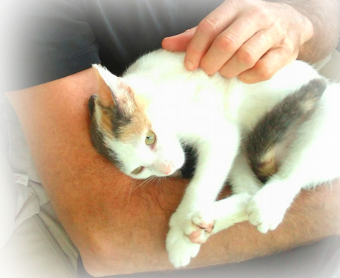 C’est en allant rendre visite à Cathy et Eric, deux amis basques amoureux de LT, que je suis tombée sur le plus craquant, le plus adorable, le plus sociable des petits chatons que l’on puisse imaginer. C’est une de leur voisine de vacances, repartie dans son lointain et froid Quebec qui l’a accueillie, soignée, l’a faite stériliser, vacciner, déparasiter. Cathy et Eric ont pris la suite mais ils repartent à leur tour dans quelques semaines et, comble de stupidité, la résidence qui les accueille refuse tout animal. Il leur a été demandé de s’en séparer.