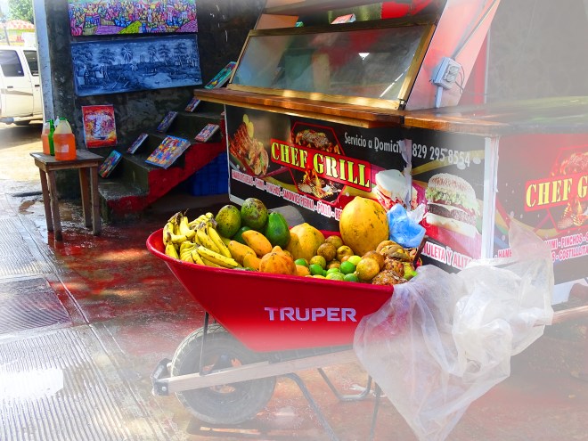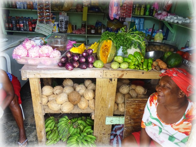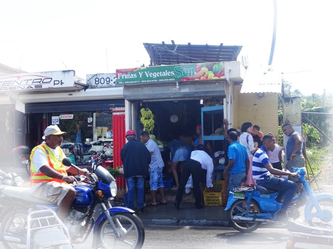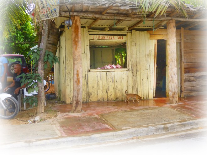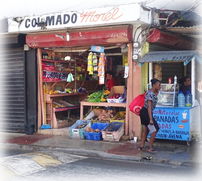 Je n’avais jamais remarqué qu’au fur et à mesure de la « montée » de la calle Principale, les petites échoppes faites de bric et de broc se transformaient en commerce « de luxe ». Non, j’rigole pas, les façades sont immenses, les vitrines exposent une foultitude d’objets surprenants, mêlant avec audace, poupées dominicaines, mamajuana, piles, tambourins, tasses et cocottes minutes, les enseignes jouent l’éloquence ou préfèrent l’anonymat et les rayons hétéroclites débordent des produits les plus spectaculaires….. de véritables supermarchés dans lesquels s’agitent sur des airs de bachata tout un tas de jolies filles et de beaux garçons.