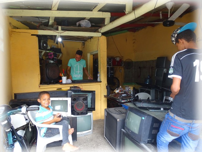 Puis, acteurs indissociables d’un charme suranné, les petits métiers confèrent sans nul doute son identité forte et son charisme à notre petit village . La musique souvent à fond, les artisans, jeunes ou vieux, véritables ambassadeurs de la vie sociale, exercent leur art avec toute la bonhomie des gens qui aiment la vie. Coiffeur high tech, à la pointe de la technologie (pablito.com) ou coiffeur d’occasion, hilare et sympathique, testant sa dextérité sur la tête d’un pote, au milieu d’une galerie de peintures en plein air, coiffeuse aussi plantureuse que talentueuse dans son salon coquet, réparateur d’électro-ménager, vendeurs de poulet crus ou vendeur de poulet rôti, fabricant de cigares, concho bien sûr mais aussi vendeur de camarones, de crabes, sans oublier les savetiers, les couturiers, etc…. tout un petit monde délicieux, savoureux, gentil et haut en couleur.