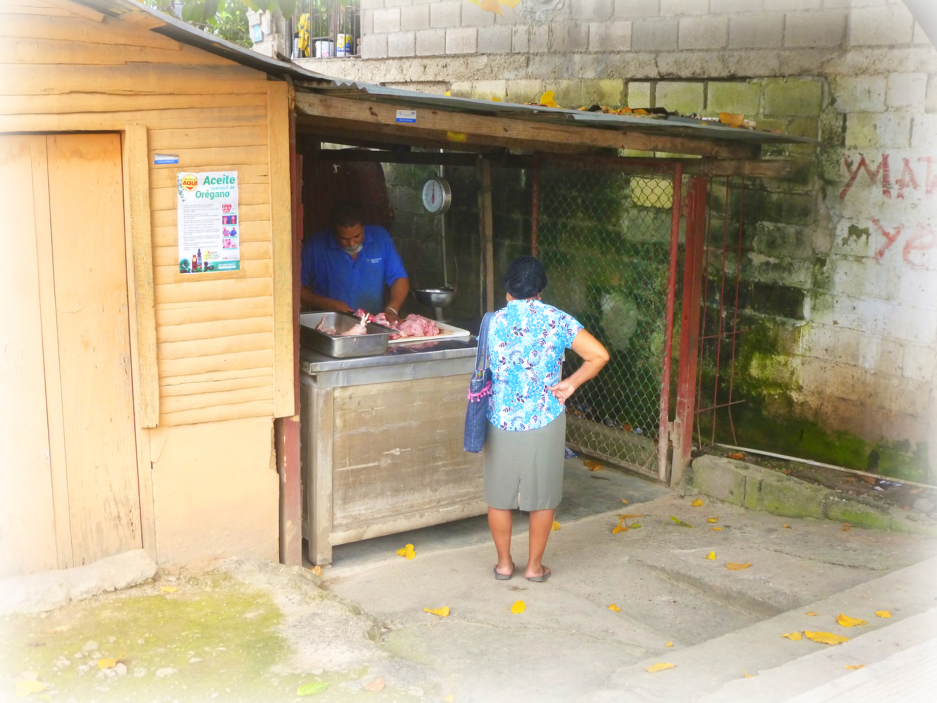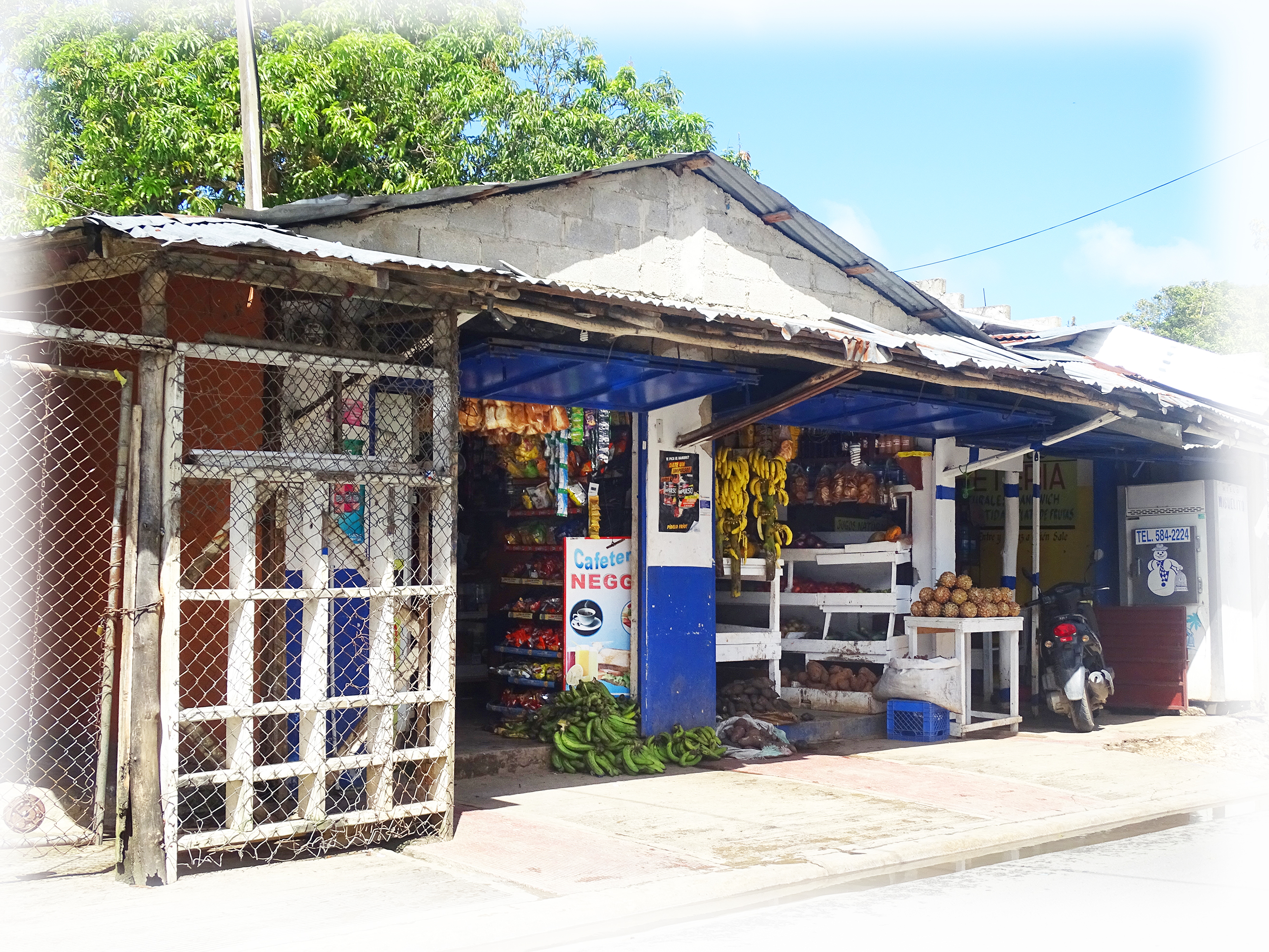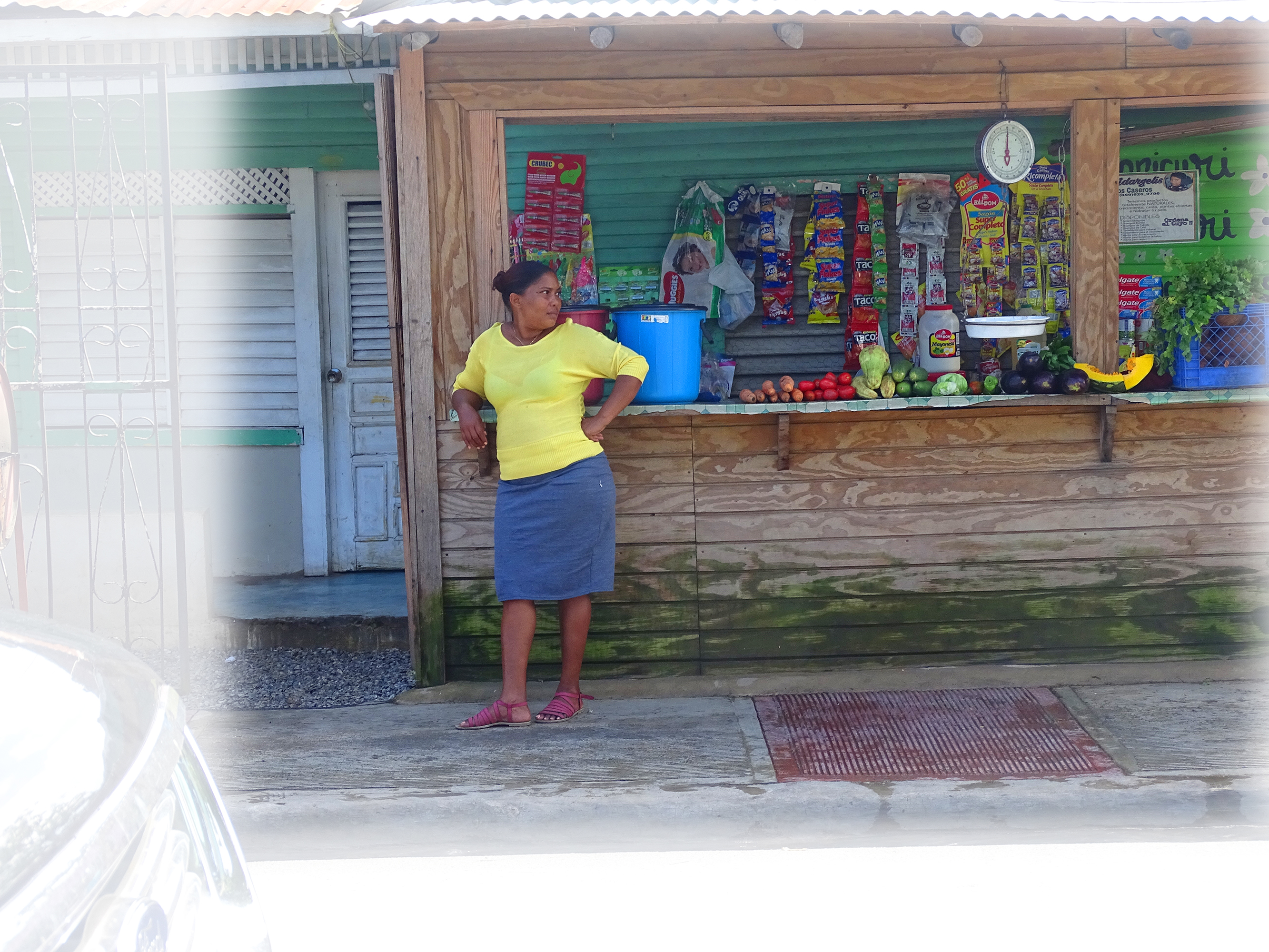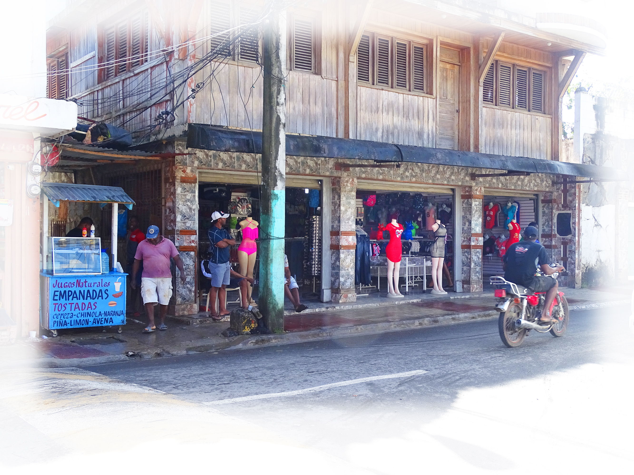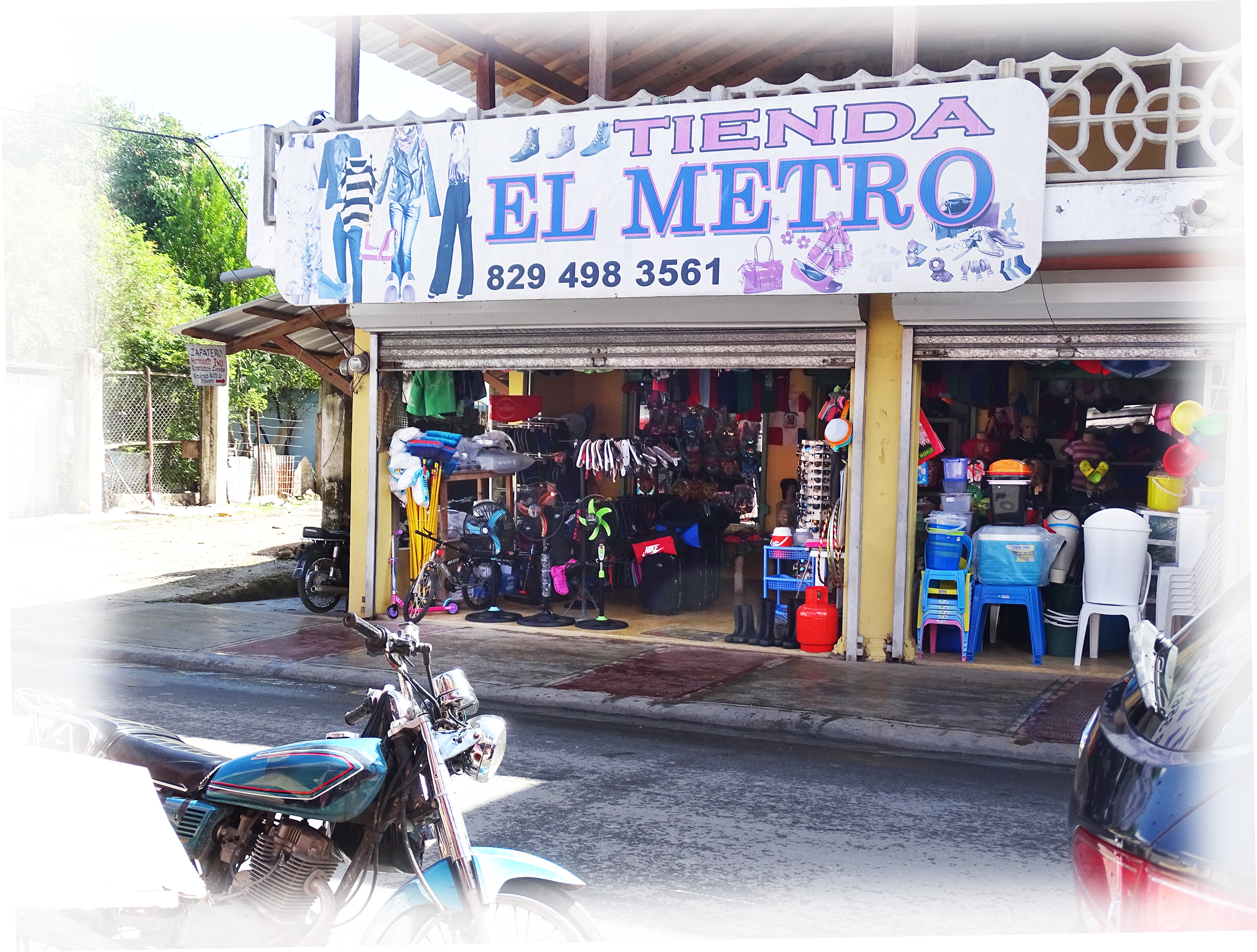 Je n’avais jamais remarqué qu’au fur et à mesure de la « montée » de la calle Principale, les petites échoppes faites de bric et de broc se transformaient en commerce « de luxe ». Non, j’rigole pas, les façades sont immenses, les vitrines exposent une foultitude d’objets surprenants, mêlant avec audace, poupées dominicaines, mamajuana, piles, tambourins, tasses et cocottes minutes, les enseignes jouent l’éloquence ou préfèrent l’anonymat et les rayons hétéroclites débordent des produits les plus spectaculaires….. de véritables supermarchés dans lesquels s’agitent sur des airs de bachata tout un tas de jolies filles et de beaux garçons.