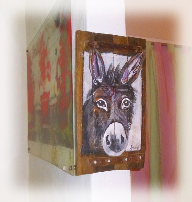 Allez, c’est l’heure de rentrer et de préparer le repas de mes 4 patounes adorés. Petit âne a trouvé sa place sur le mur du bungalow bureau-chambre anti-cyclonique, le décor lui va à ravir.