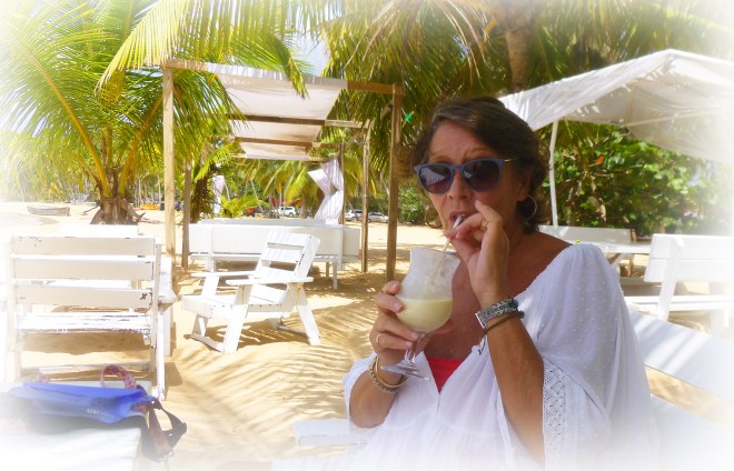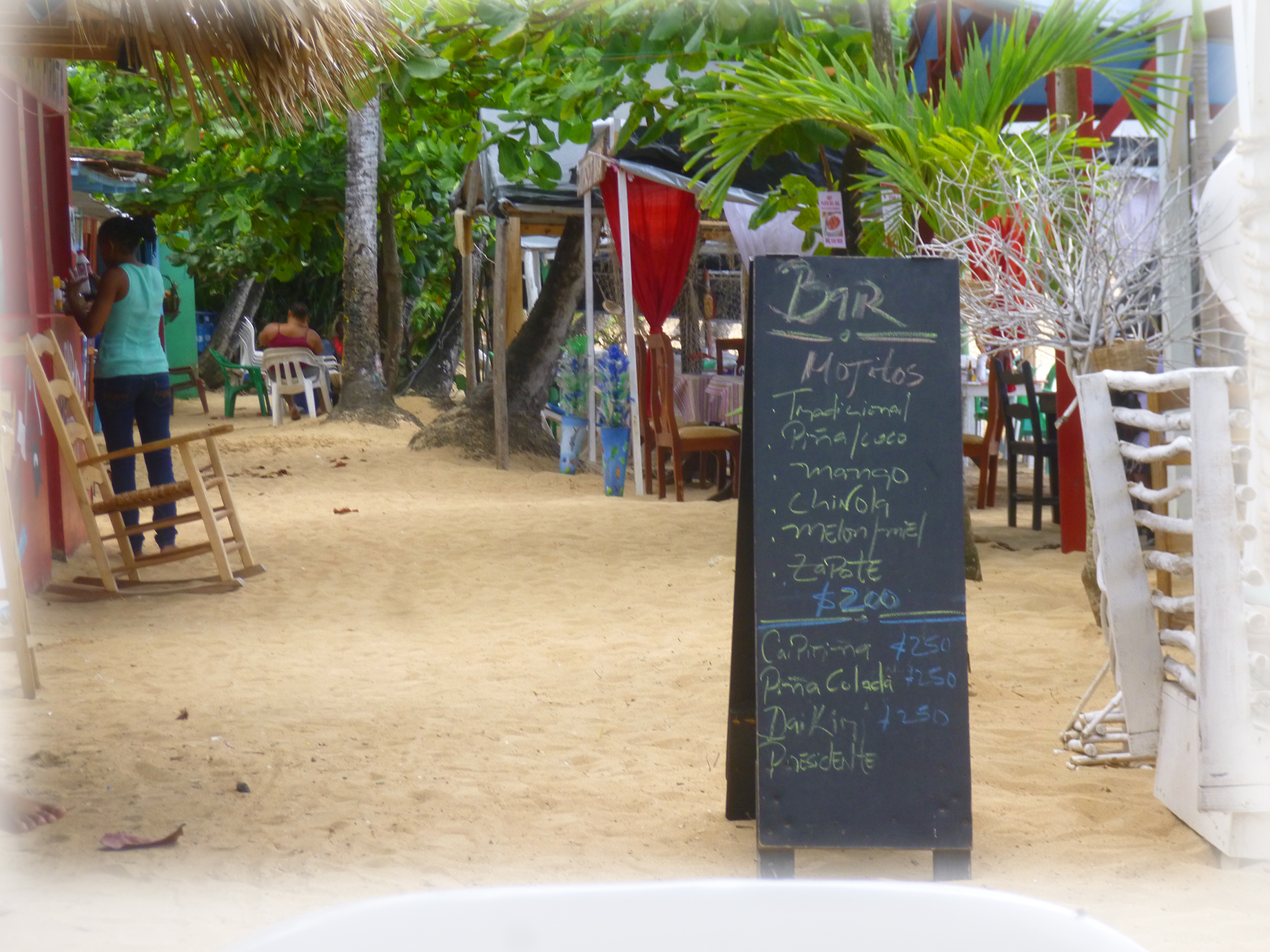 C’est chez Sarah que nous déjeunons. J’adore cet endroit hors du temps derrière le cimetière (je sais, à priori, l’adresse n’a rien de glamour, et pourtant….) un bric à brac de cabanes rafistolées et pas toujours bien droites, arborant fièrement des couleurs acidulées, des toiles rustiques pour se protéger du soleil, des chaises et des tables parfois brinquebalantes, et un charme fou, une âme, plein d’amour et de joie, des mômes heureux qui courent entre les clients, un chat qui s’étire paresseusement, des devantures colorées et une bonne odeur de cuisine locale, de poisson frais…. J’adore. Pas grand monde aujourd’hui, il faut dire que l’on est en plein dans la saison creuse de chez creuse… Mais quelques convives attablés chez Sarah qui, aujourd’hui ne quitte pas ses fourneaux…. Pour moi, ce sera filet de chillo, sauce au beurre d’oursin accompagné du « riz de Sarah »….. si vous n’avez jamais goûté au riz de Sarah, vous êtes passés à côté d’un grand moment, c’est comment dire…. divin….. Mimi, fidèle à lui-même s’en tient à ses crabes farcis et petite salade fraîche d’avocats. Délicieux. Tiens, un nouveau venu dans la communauté des cabanes de la mer, Zu, il s’est glissé entre Sarah et Coseco le poissonnier et, n’a pas hésité à monter de toute pièce un bar à Mojitos. Il y en a aux fruits de la passion, au coco, à la mangue, à l’ananas, au melon et même au zapote…. Pas mal l’idée. Il est encore un peu tôt, alors…. allez, c’est la dernière fois …. je craque pour mon pêché mignon…. nous retournons près de chez nous, à la Vela Blanca où je fonds de bonheur en sirotant mon habituelle Pina Colada dans le décor grandiose d’une plage déserte de sable blond.