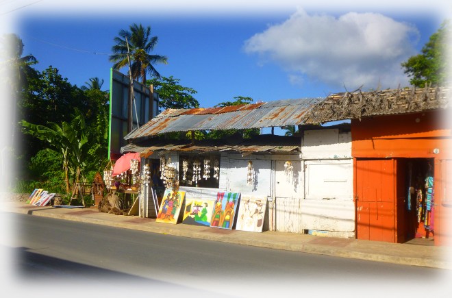 Parfois, le temps est radieux, parfois quelques gouttes de pluie ravissent l’exubérante végétation qui nous enveloppe et nous émerveille à chaque instant. Quand le soleil brille, de temps en temps, j’ose franchir les portes de mon château de feuilles, mon nid douillet et, c’est chaque fois avec le même émerveillement que je retrouve l’océan, le sable blanc et les rues espiègles de mon village.