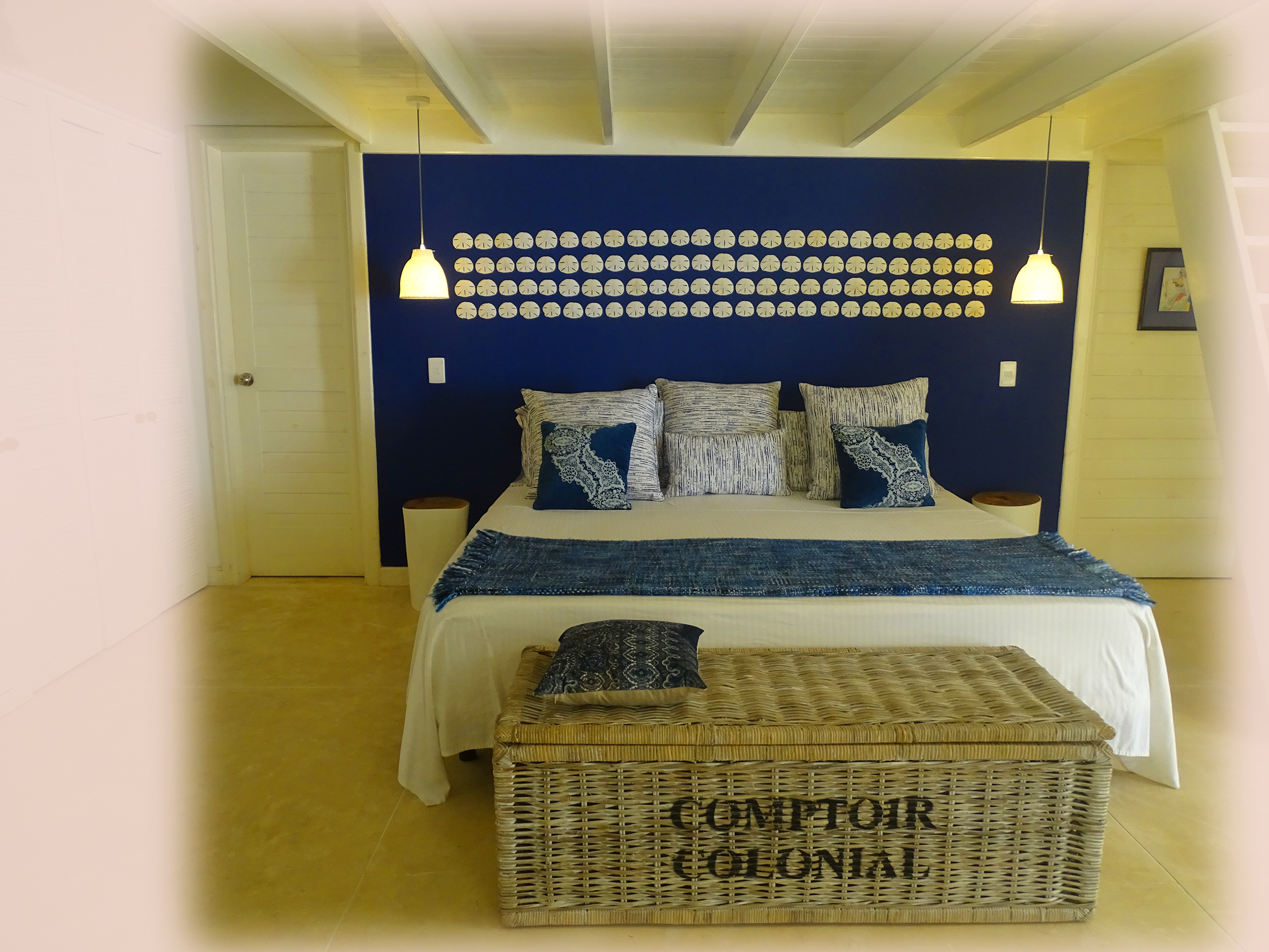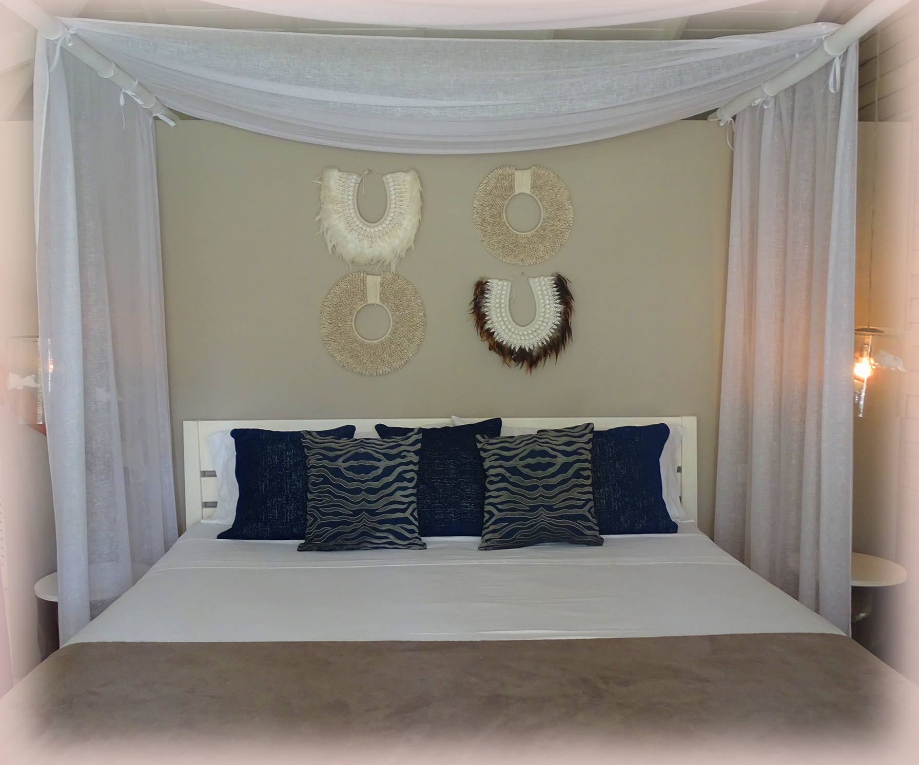 Il faut dire que la belle dame n’en est pas à son premier relooking. Architecte d’intérieur de renom, elle s’est spécialisée dans la déco d’hôtel dans le monde entier. Sa vision délicate et son grand professionnalisme ont su insuffler une vie nouvelle à ce lieu au fort potentiel, le métamorphosant en un petit nid cosy et tendance. Adepte d’un style ethnique chic qui fait la part belle aux matières nobles et aux tons naturels, la créatrice imagine une mise en scène intemporelle, propice au voyage. Elle mélange avec audace des objets aux lignes épurées, contemporains ou chinés dans des brocantes, des lustres de cristal tarabiscotés et de délicates suspensions en biscuits, en verre soufflé ou en jonc naturel…. des pinceaux géants de Thailande, de fabuleux colliers de papous, des antiquités romaines, des chapeaux de paille ou des dollars des sables, du bois précieux, lin, coton, chanvre, osier, peau de bêtes, cuir, corne, jute…
