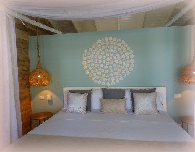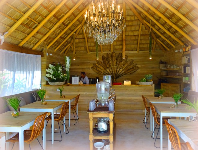 Afin d’effacer au plus vite les désagréments d’un voyage parfois épuisant ou juste pour vous faire plaisir, un ravissant salon d’esthétique, abrité sous un vaste toit de palmes vous accueillera pour un massage relaxant, vivifiant, un soin, une épilation, une remise en beauté….. Un peu plus loin, au détour d’un sentier fleuri, de quelques orchidées, un autre toit de palme. C’est l’endroit privilégié des petits-déjeuners, un espace absolument délicieux où un incongru mais fabuleux lustre de cristal se partage la vedette avec de majestueuses feuilles de palme en bronze. Le moment-bonheur où l’art de vivre prend tout son sens et où l’on aime papoter avec les hôtes, partager ses impressions de la veille, s’échanger de bonnes adresses et savourer les délicieuses gourmandises de la maison. Savoureux pain perdu aux parfums de l’enfance, croissants croustillants, pain tout frais, confitures maison, salades de fruits préparées avec amour et jus pressés minute. Le personnel, à l’image de Béa et Daniel, est adorable et déborde d’attention pour les convives ravis.