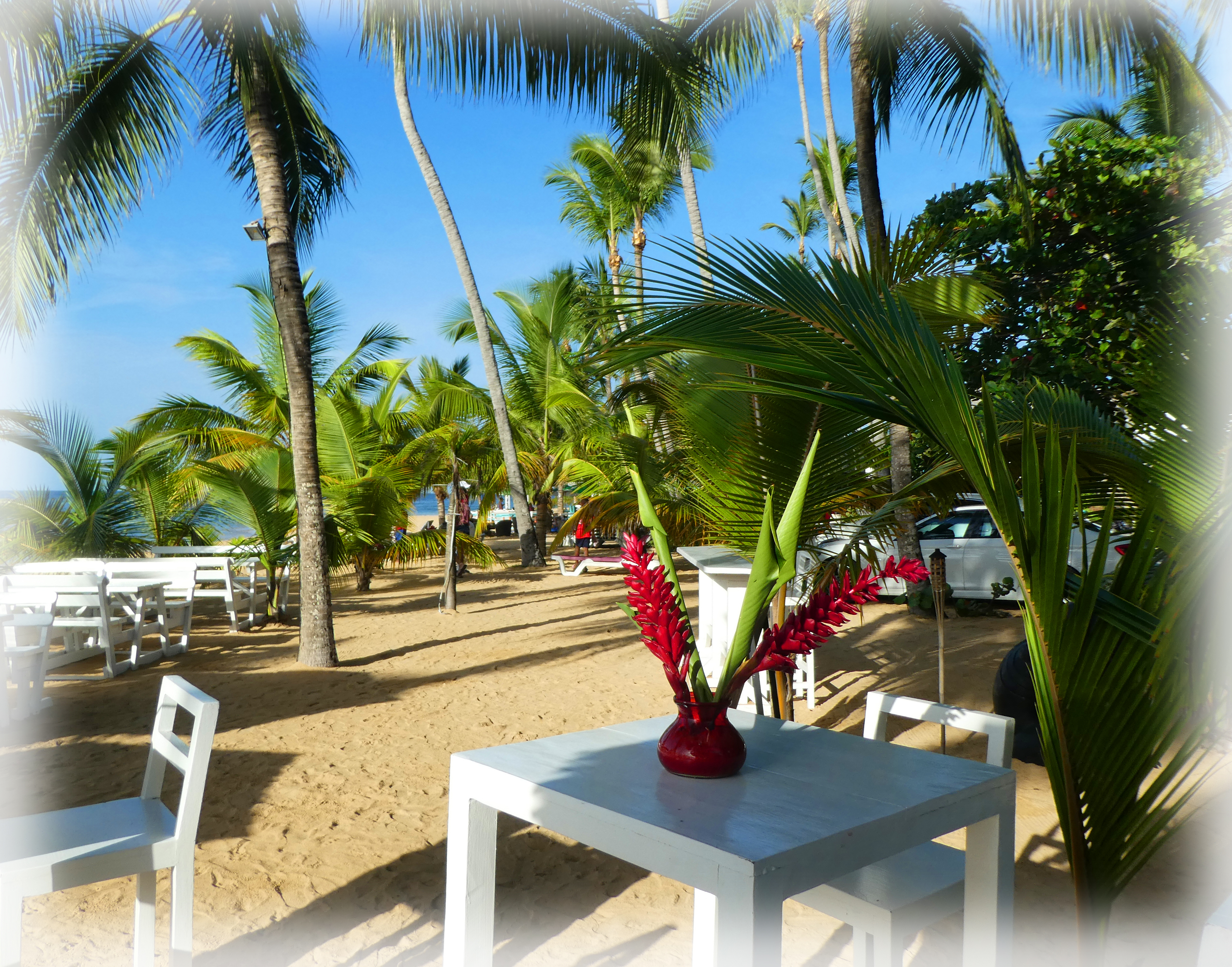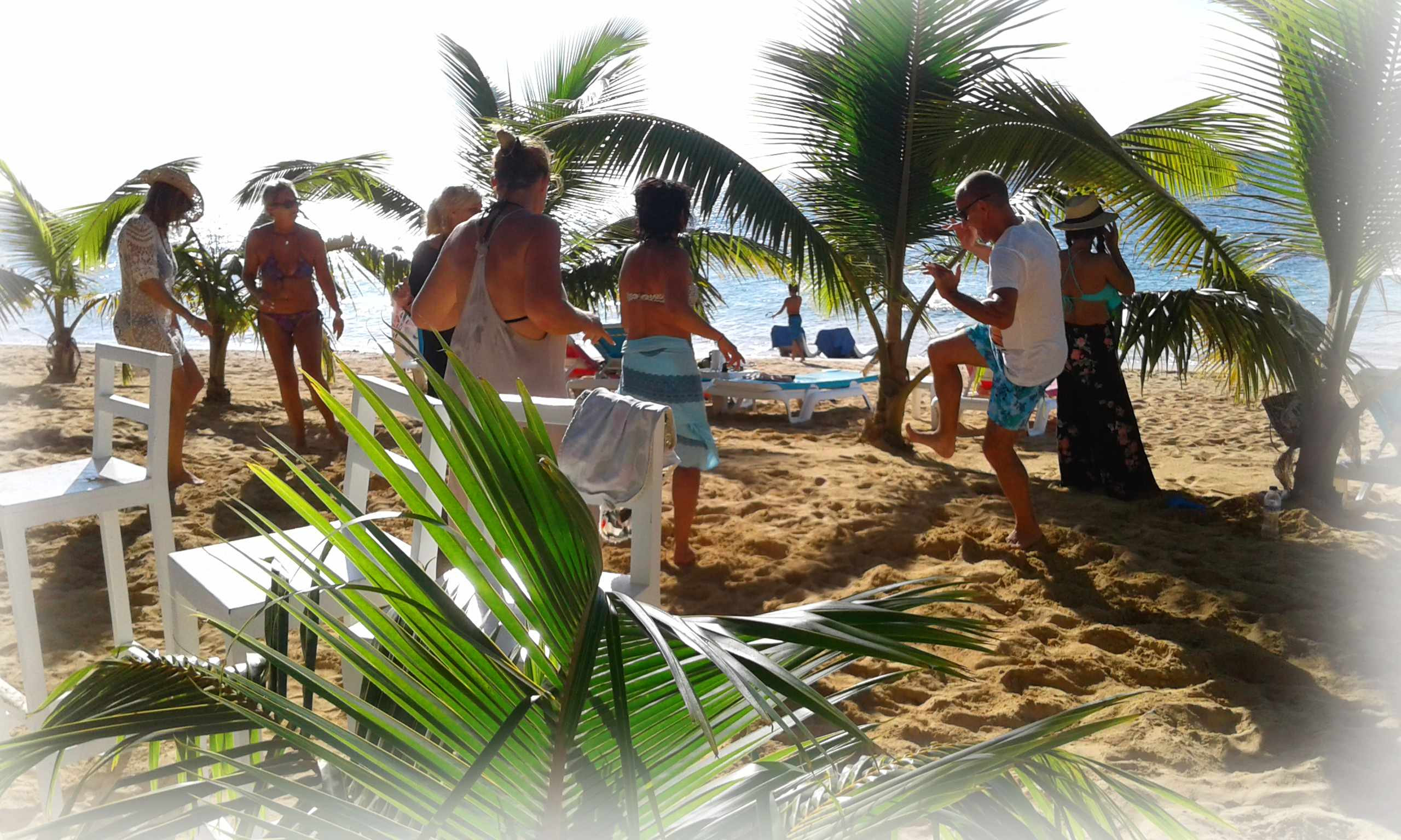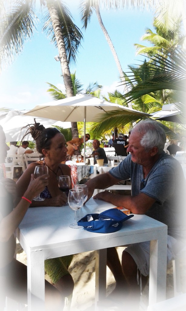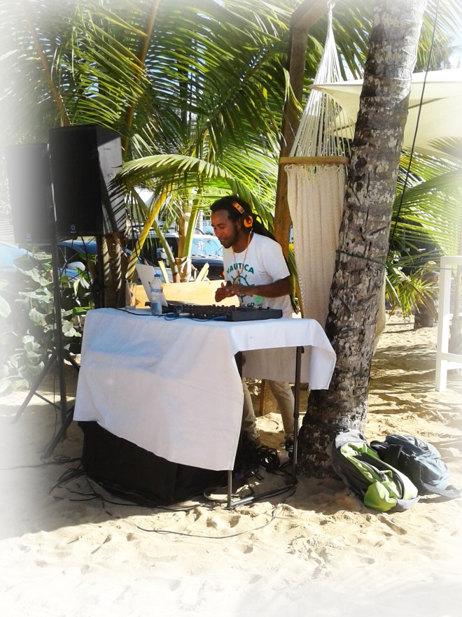 Chez mon ami Pierre. Waouh, c’est la fête à l’Eden. Il y a un monde fou, toute la jet set de Las Terrenas s’est donnée rendez-vous « au paradis » pour faire la fête. C’est sympa ! Que des bouilles connues, Alain, Laurent, Jean, Sergio, Josée, Elsa, Jacques, Aude, Brice, Sandra, Clarisse, Jordi…… Le DJ est au top et maîtrise à la perfection un sujet qui, pourtant, doit lui sembler bien barbare…. La musique disco française des années 80 enchante tout ce petit monde . L’ambiance est décontractée et le rosé coule à flot, bon d’accord, les caipiriñas ne sont pas en reste, les Cuba ou autres Santo libres non plus d’ailleurs. Dans ce décor de rêve, sous un ciel bleu de chez bleu et un soleil éblouissant, l’ambiance est sereine. C’est comme une parenthèse enchantée. Il y a de tout petits enfants gentils, de jeunes adultes même pas nés dans les années 80, des résidents, vieux de la vieille, d’anciens résidents, des nouveaux, des juste arrivés et tout le monde papote, gigote, danse même dans le sable, avec en toile de fond le plus beau des décors que l’on puisse imaginer. Merci Pierre pour ce délicieux moment de bonheur, de partage, d’amitié. On y prendrait vite goût, mais, je sais, tu m’as raconté les péripéties d’une telle entreprise. Dommage de ne pas réussir à convaincre ces « messieurs haut placés » du bienfait de telles initiatives sur l’image de marque du village.