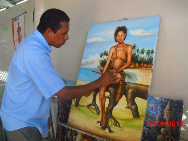 Il est adorable Alfredo. 52 ans mais on lui en donne 20 de moins. Très jeune, il s’est découvert un don et une passion pour la peinture. En grande partie autodidacte, il est cependant diplômé de l’Ecole des Beaux Arts de Santo Domingo où il a développé sa technique picturale et s’est initié à la sculpture. Sa grande source d’inspiration, la prodigieuse nature de notre région, les arbres grandioses, les fleurs, la mer, les barques de pêcheurs… mais aussi l’histoire riche et variée de cette belle péninsule, ses habitants et surtout ses beaux enfants aux visages ouverts et souriants. Et puis, parfois, son esprit vagabonde et c’est la rencontre avec de grandes plaines douces, des vaches et des paysages bucoliques. Il peint sur tout, sur les murs, on lui doit notamment les jolies fresques habillant le mur du cimetière (en collaboration avec Marie), sur du papier, du bois ou des toiles, à l’huile, à l’acrylique ou l’aquarelle. Et, s’il aime s’évader dans sa peinture à ses rares moments perdus, c’est surtout sur commande qu’il réalise ses tableaux. Sa clientèle est aussi éclectique que sa peinture qui se balade du trompe l’œil à l’abstrait en passant par l’hyper réalisme voire le trompe l’oeil, le naif ou le surréalisme le plus déjanté. Une constante, des coloris lumineux, et des formes douces et harmonieuses. Il y a quelques années, il s’est lié d’amitié avec un autre peintre célèbre et charismatique, Michel Bizet. Ensemble, ils ont créé l’Institut de l’Abeille( https://dorislasterrenas.com/2017/07/28/parenthese-enchantee/ ) et, en compagnie d’autres amoureux se démènent pour sa sauvegarde. Einstein disait : Si les abeilles venaient à disparaître, l’espèce humaine n’aurait que quatre années à survivre !….. Alfredo s’en est inspiré dans un tableau très touchant. Alfredo expose quelques-unes de ses toiles et de ses sculptures dans une petite galerie face au cimetière. Mais c’est souvent le simple bouche à oreille qui permet aux amateurs de belles peintures authentiques de le découvrir, et, à ce jour, plus de 600 toiles signées de notre artiste s’égaient à travers le monde.