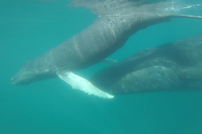 Quant aux mâles… Ils savent se montrer infatigable pour séduire leur belle et affirmer leur supériorité. Ces messieurs baleines sautent hors de l’eau, cabriolent, se dressent à la verticale ou frappent de leur nageoire la surface de l’eau, ils chantent aussi et les baleines ayant une ouïe très développée (leur principal sens), elles peuvent entendre le chant jusqu’à 35 kms !