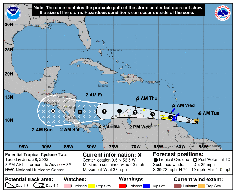 Ils naissent majoritairement près du Cap Vert et le https://www.nhc.noaa.gov/ entre autres les suit depuis leur apparition. Donc, nous aussi. Chaque jour le pourcentage de risque cyclonique s’inscrit sur la carte très bien faite. 10%, 20%…de chance. L’item représentant l’intru change lui-aussi en fonction de son évolution… croix jaune, orange, rouge… etc. Tout est très clair et très fiable. Dès que le phénomène est suffisamment inquiétant pour porter un numéro, un ‘’tracking’’ est effectué, des jours a l’avance, définissant de manière plutôt précise la direction de la perturbation. Celle-ci est nommée dès qu’elle passe dans la catégorie cyclone (https://dorislasterrenas.com/2022/06/03/saison-cyclonique-2022-on-y-est/).