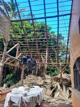 Après les pluies diluviennes de la semaine passée et après m’être voilée la face et caché les gouttes d’eau sous des serviettes, je me suis rendue à l’évidence, le moment fatidique était arrivé, il fallait changer la cana. Poussée par je ne sais quelle folie, je me suis renseignée méticuleusement, prête à trahir mon toit de feuilles pour du synthétique. Sauf que non, il m’en coûtait quelques dizaines de milliers de dollars. Ce ne sera pas pour aujourd’hui. Penaude, je me suis excusée auprès de ma cana et j’ai contacté ce cher Riccardo pour commencer les travaux au plus tôt. Comment vous dire, plus de 20 ans que je travaille avec Ricardo. C’est une catastrophe au niveau organisation. Il n’est jamais sur le chantier et ses ouvriers, livrés à eux-mêmes passent plus de temps sur leur mobile que sur les clous et le marteau. Et puis il parle fort, ce qui effraie les chiens donc, il a peur des chiens…Du coup, j’ai employé un superviseur pour faire son boulot et canaliser un peu tous ses gens. Bon je dois reconnaitre que malgré ses défauts, Ricardo est un vrai pro. Il aime et est fier de son job.