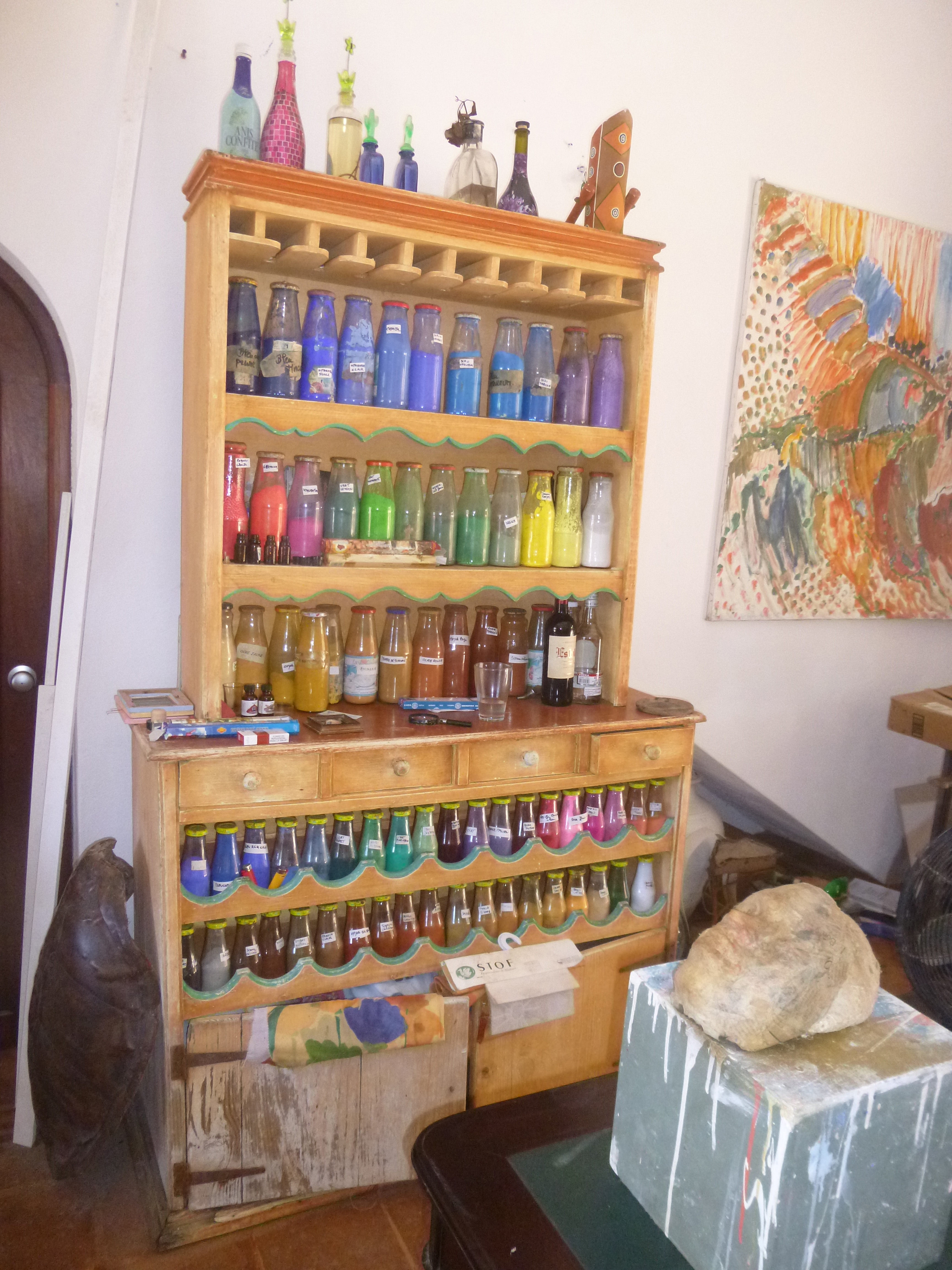 Son atelier-galerie ouvert à tous, se situe au Paseo, à côté de la Cave à vins. C’est avec beaucoup de gentillesse qu’il nous y accueille et nous guide à travers son oeuvre très hétéroclite qui oscille,sans jamais choisir, entre naif, pointillisme, impressionnisme. Sa peinture-fusion comme il se plait à la qualifier est inspirée par son vécu, mais, phénomène de pure création et résultat de l’imagination d’un artiste sensible, ses toiles sont remplies d’une forte dose d’émotion. Son travail instinctif qui confère un caractere ingénu aux oeuvres , s’articule autours du glamour de ses exquis visages de femme et d’un impressionnisme étonnamment juste et délicat. Charlie, érudit et intarissable en matiere d’art, voue une passion à Picasso, génial « touche a tous » , innovateur insatiable, à l’aise dans tous les courants picturaux. Un peu lui donc. S’il en a fait son « modèle », il apprécie également l’art poétique de Chagall et la folie de Jean Dubuffet.