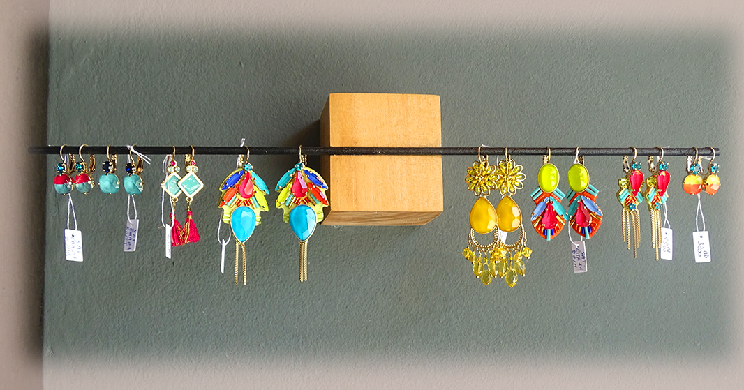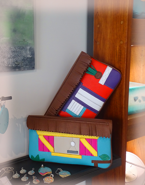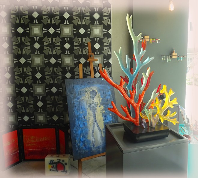 De ci de là, de précieux éventails, des bougies Absolute Tree Life qui, coquettes, se parent de dollars des sables, de larimar. Des pochettes, des sacoches, des sacs à main signés Fiori, arborent fièrement les couleurs des casitas de notre village. Puis, des broderies personnalisées, quelques toiles de Christine Pacaud, de Michel Bizet…. les créatures étranges et le monde imaginaire de Michel Voleau, photographe….
