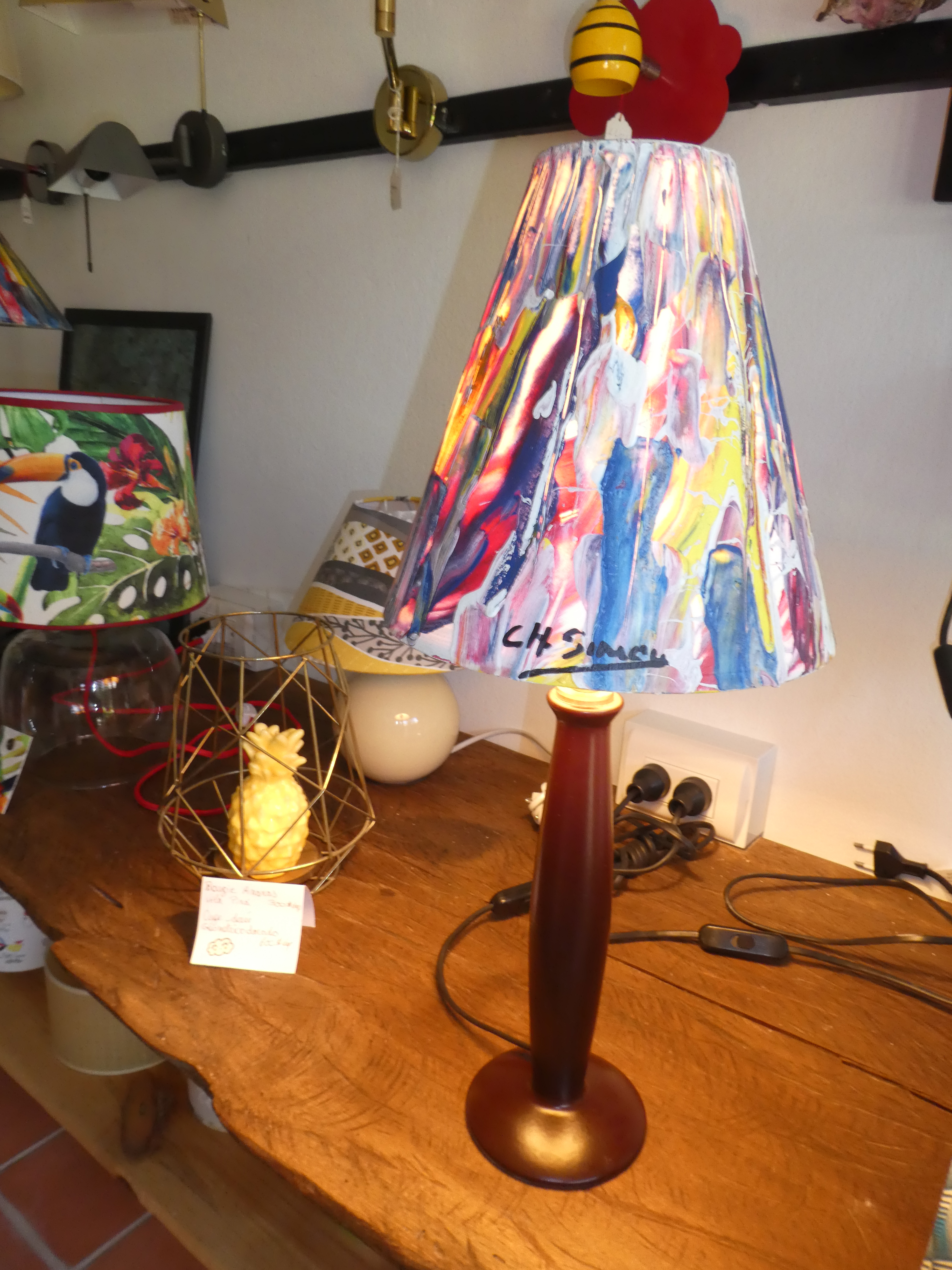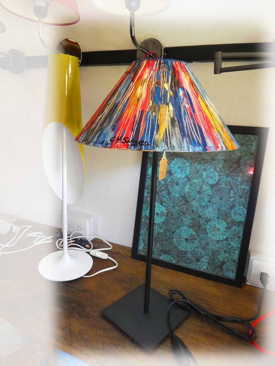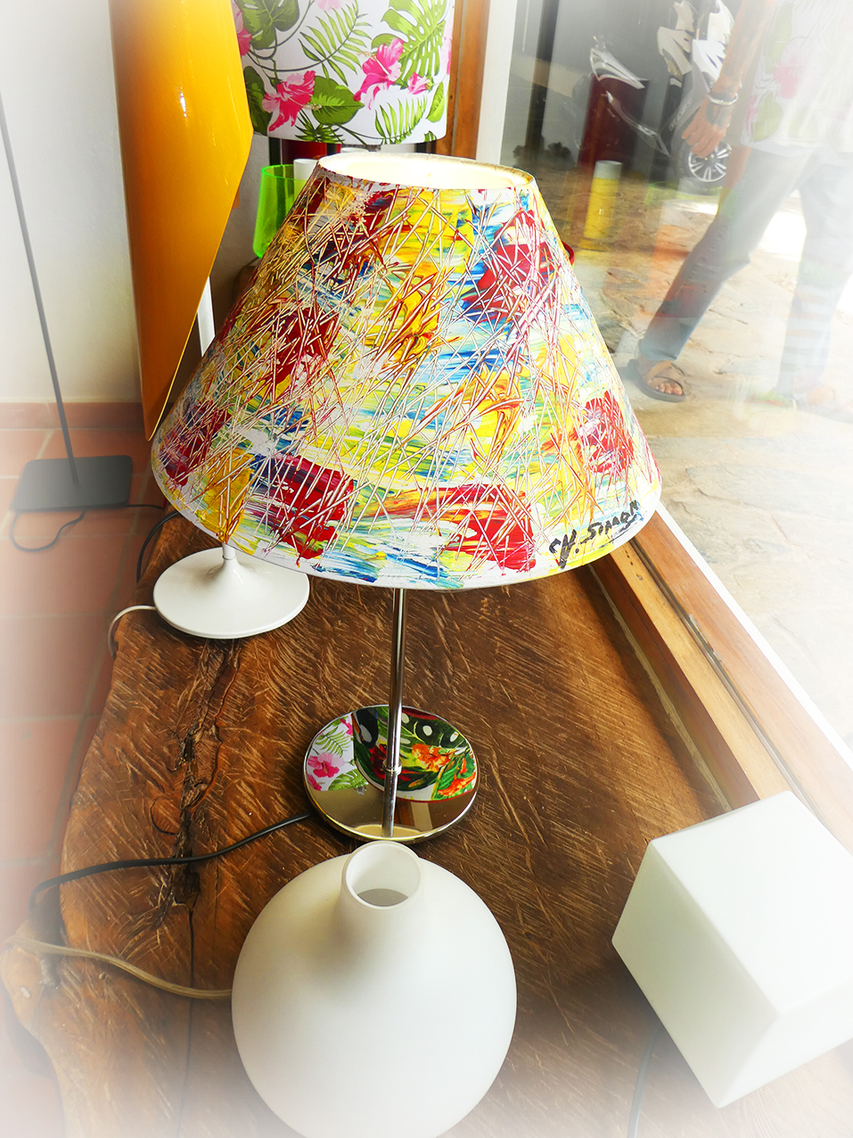L’atelier-boutique de Melissa est situe au Paseo et, son voisin n’est autre que Charlie Simon, peintre talentueux que l’on ne présente plus. Vous voyez où je veux en venir…. Charlie, peintre, toile, abat-jours…. Deux ans qu’elle le harcèle pour qu’il accepte de travailler avec elle en mettant son art au service de ses abat-jours….2 ans. Puis, un jour, il a craqué. Pour le plus grand plaisir de Melissa et le nôtre, il a dit oui et depuis quelques jours, sur les rayonnages de Cinco y mas de sublimes lampes signées Charlie Simon côtoient les créations de Melissa. Le résultat est juste bluffant. Charlie peint directement sur les toiles blanches montées sur l’abat-jour. On y retrouve sa patte unique, un séduisant travail, lumineux et coloré, très hétéroclite, qui oscille entre naif, pointillisme, impressionnisme. Sa peinture-fusion comme il se plait à la qualifier est inspirée par son vécu et s’articule autour du glamour de ses exquis visages de femme, sa signature, qu’il compte reproduire sur les lampes et d’un impressionnisme étonnamment juste et délicat.