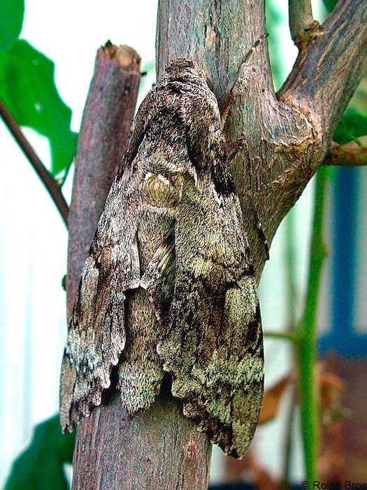 Comme chacun sait, les chenilles deviennent des papillons. Or, la chenille du frangipanier devient un papillon de nuit ou «nocturne». Il s’agit du Sphinx du Frangipanier. Il possède un corps beaucoup plus puissant et fuselé que les papillons de jour. C’est un très grand papillon: son envergure peut atteindre 15 centimètres (envergure = dimension des ailes). Ses ailes avant, sont très allongées, ses ailes arrière sont beaucoup plus courtes. Il a un vol vibrant comme un colibri et il peut butiner les fleurs sans se poser. La femelle est toujours plus grande que le mâle. Elle pond des œufs qui donnent des larves qui deviennent ensuite des chenilles. Quand une chenille a fini de grandir, elle descend de la plante et se fait un cocon formé de feuilles mortes collées entre elles par des fils de soie. Dans cette logette, la chenille se transforme en chrysalide que l’on appelle en créole «tobitobi» . Du cocon sortira un papillon tout gris et moucheté, se confondant parfaitement avec l’écorce d’un arbre où il se pose.