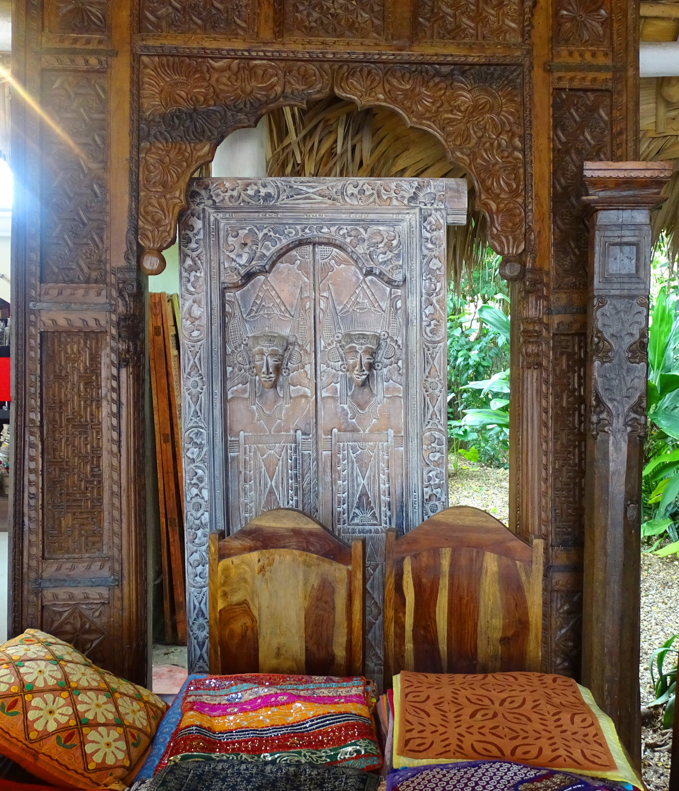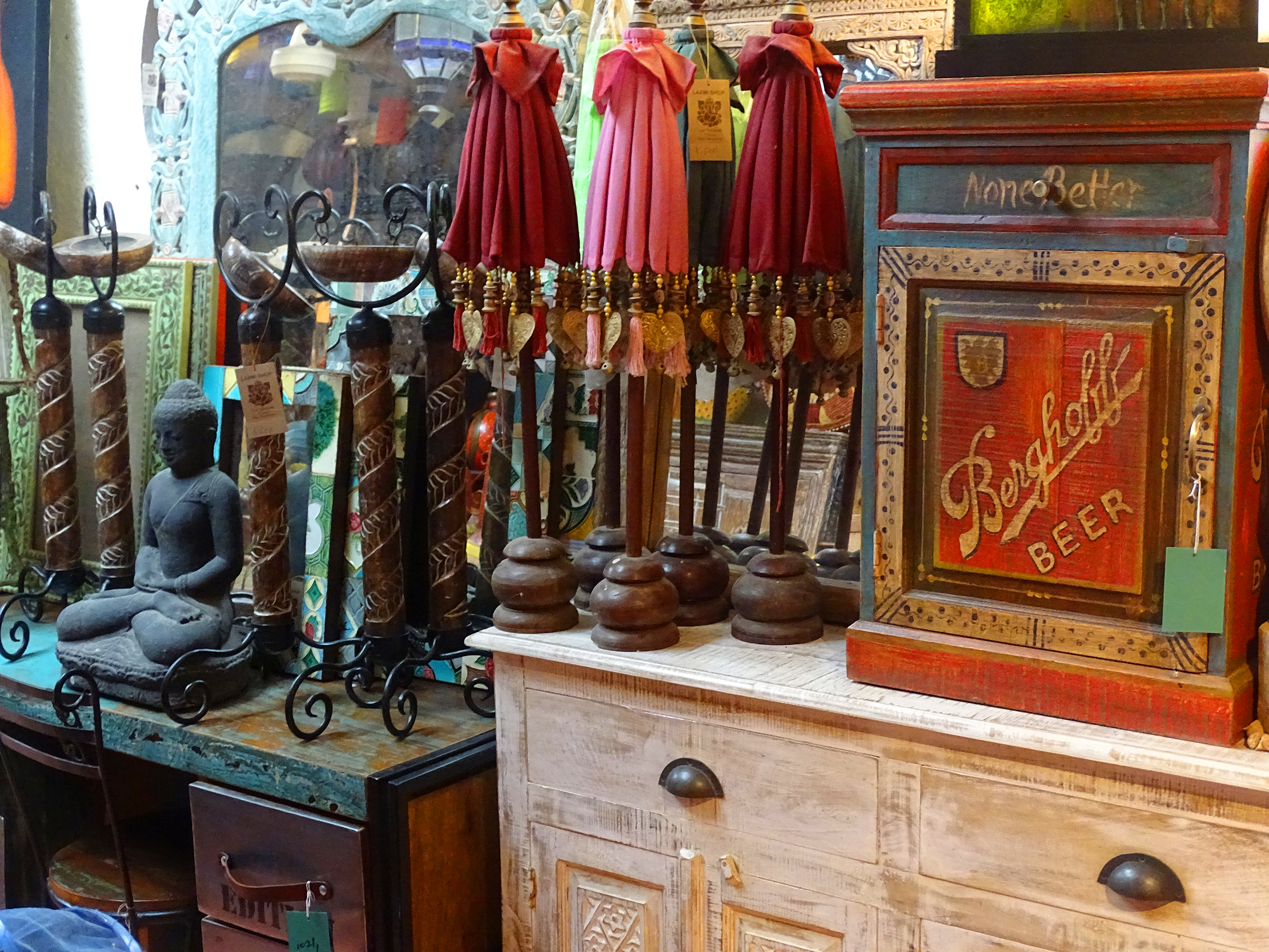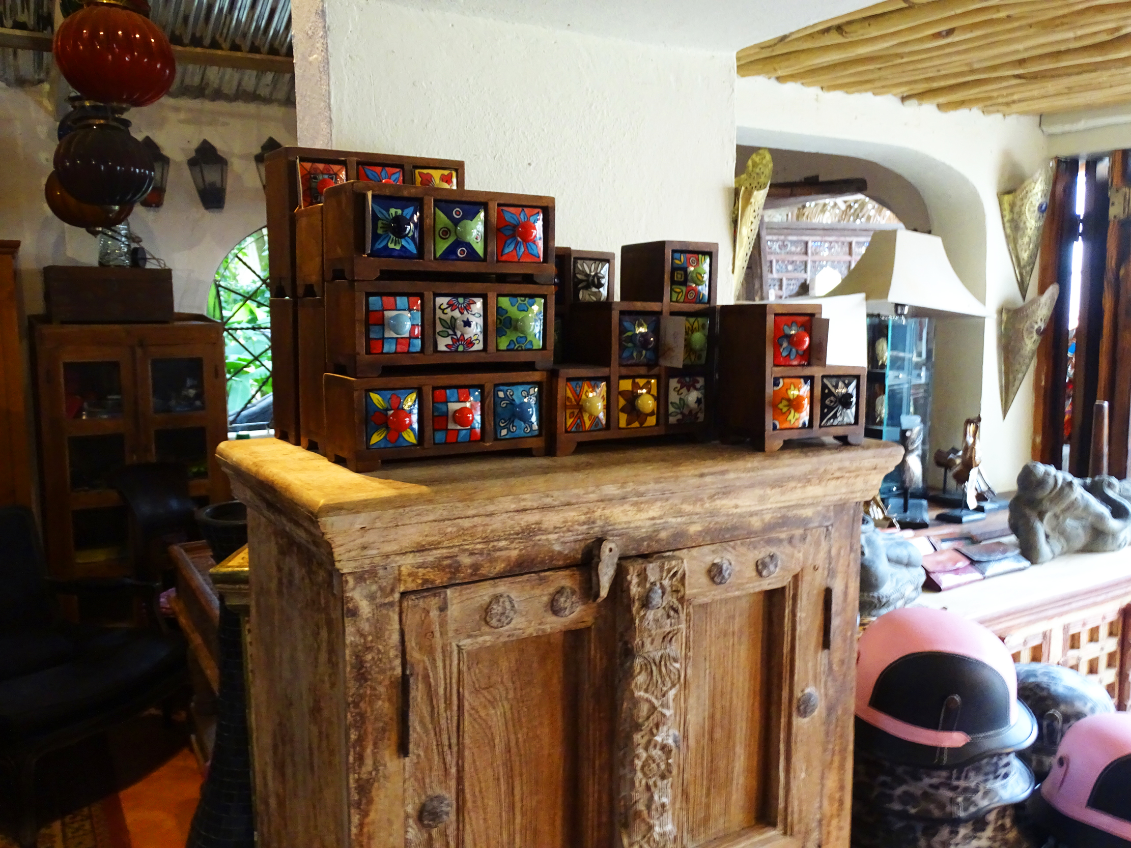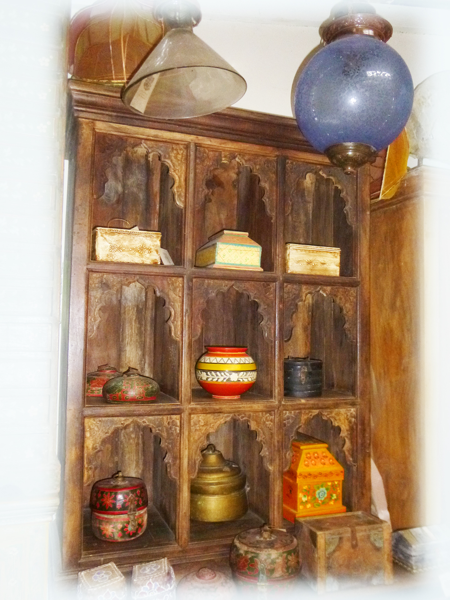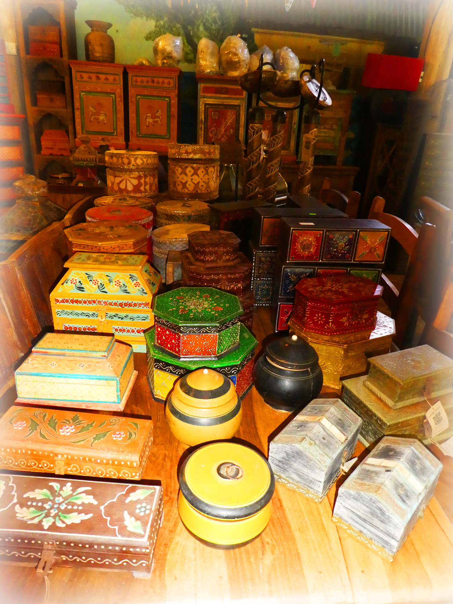 Lits à baldaquins, portes sculptées, bureaux, tables de nuit trop mignonnes chaussées d’escarpins roses, bahuts, chaises, tables. Mais aussi statuettes de divinités indiennes ou de ballerines indonésiennes, bougeoirs dorés, lustres à pampilles, miroirs, lanternes, boîtes émaillées pour enfermer vos précieuses épices, photophores en métal, tapis, abat-jours découpés, bols et récipients ultra-colorés, bijoux de pacotille (ravissants!!!!) de Goa, en verre, nacre, coquillage : la liste est longue, presque infinie, des accessoires qui, posés un peu partout, vont créer une ambiance unique, associés à des tissus à profusion, en soie, des cotonnades ou du cachemire.