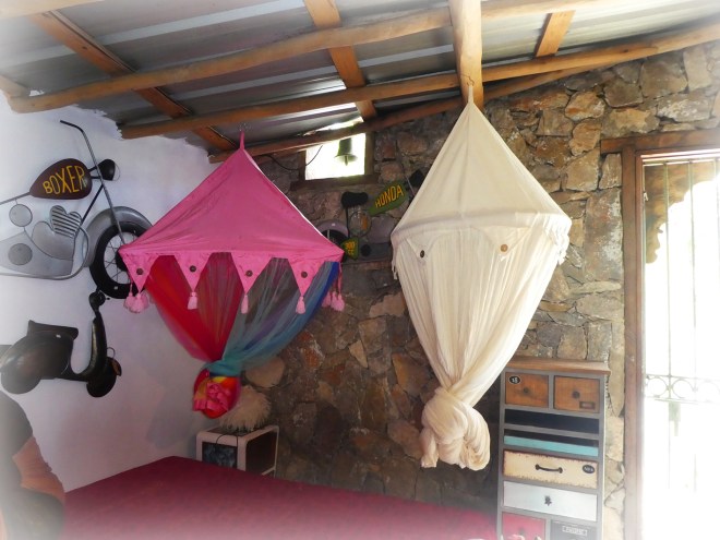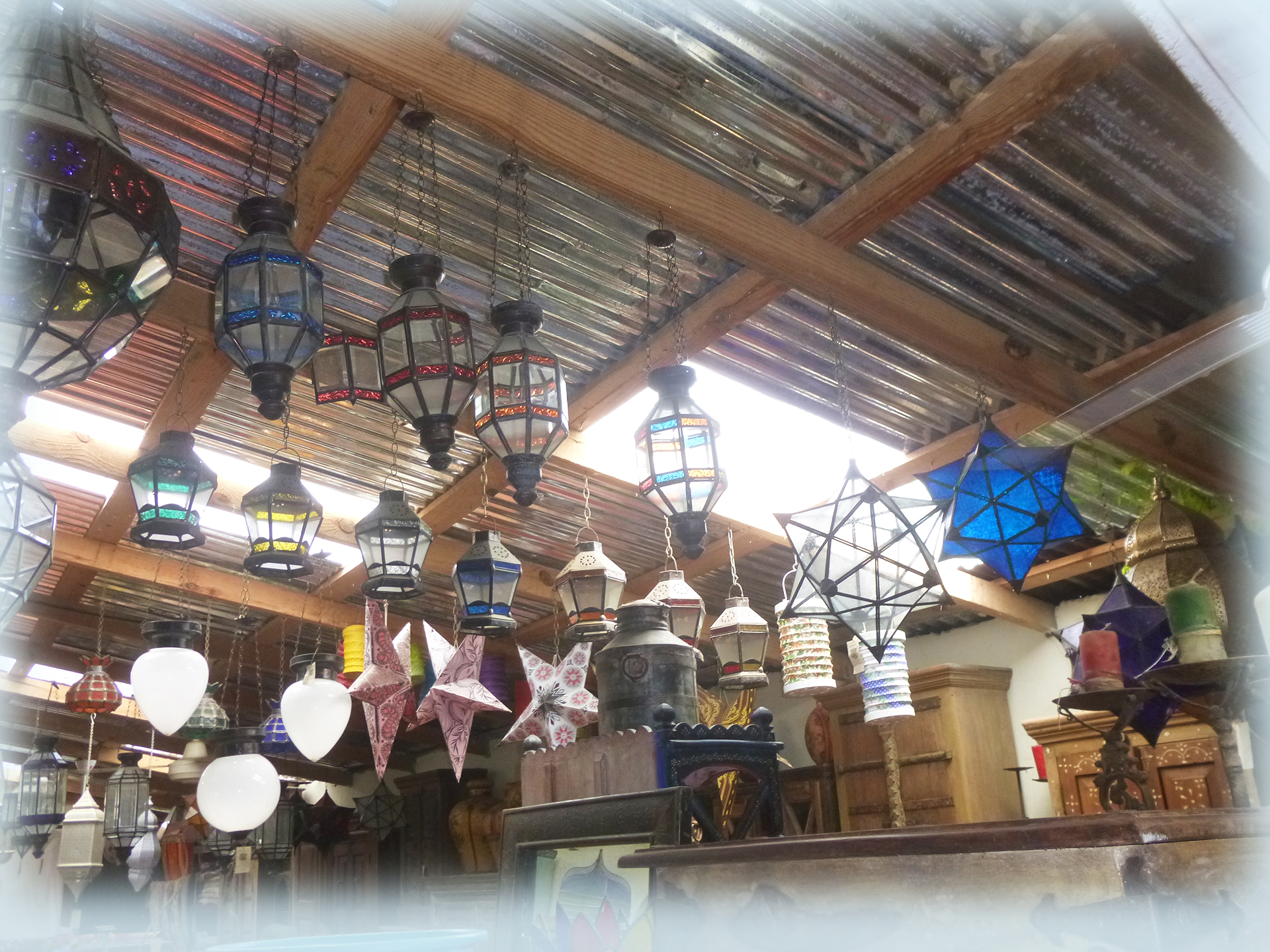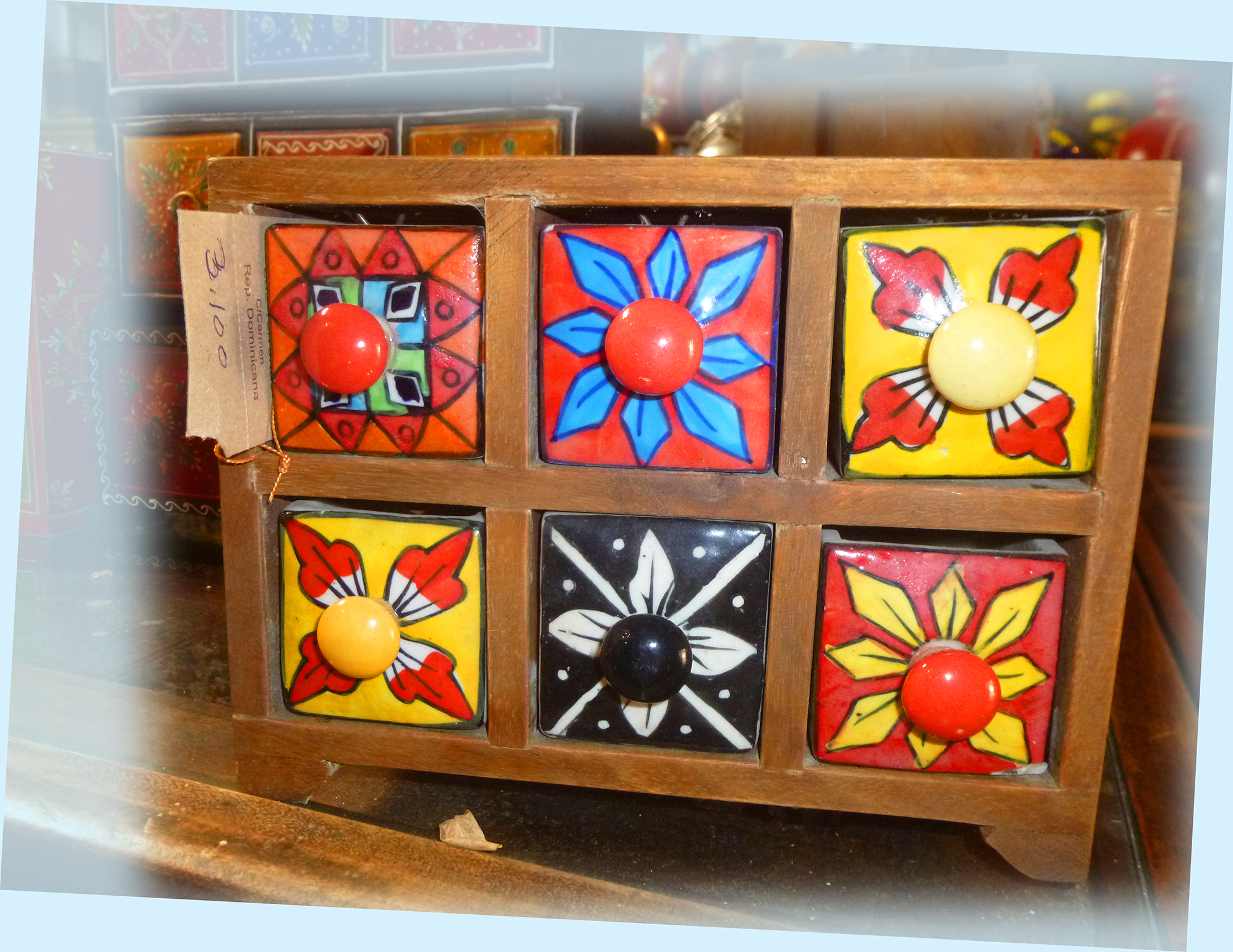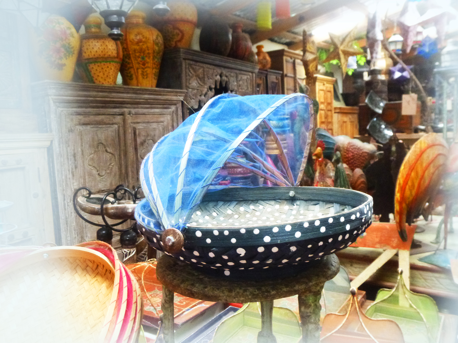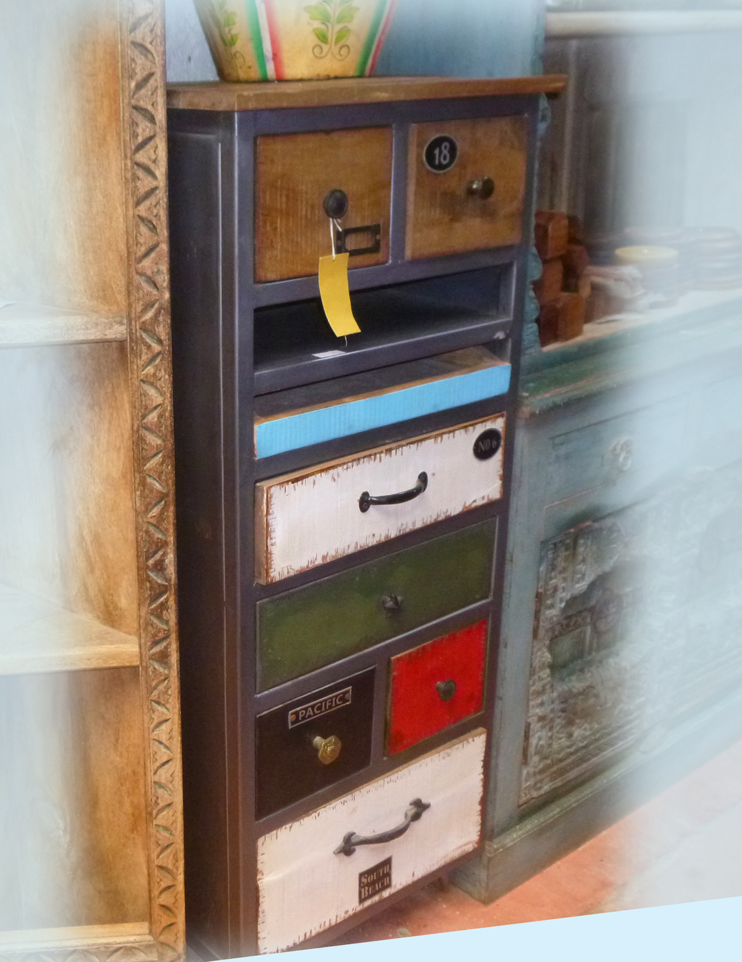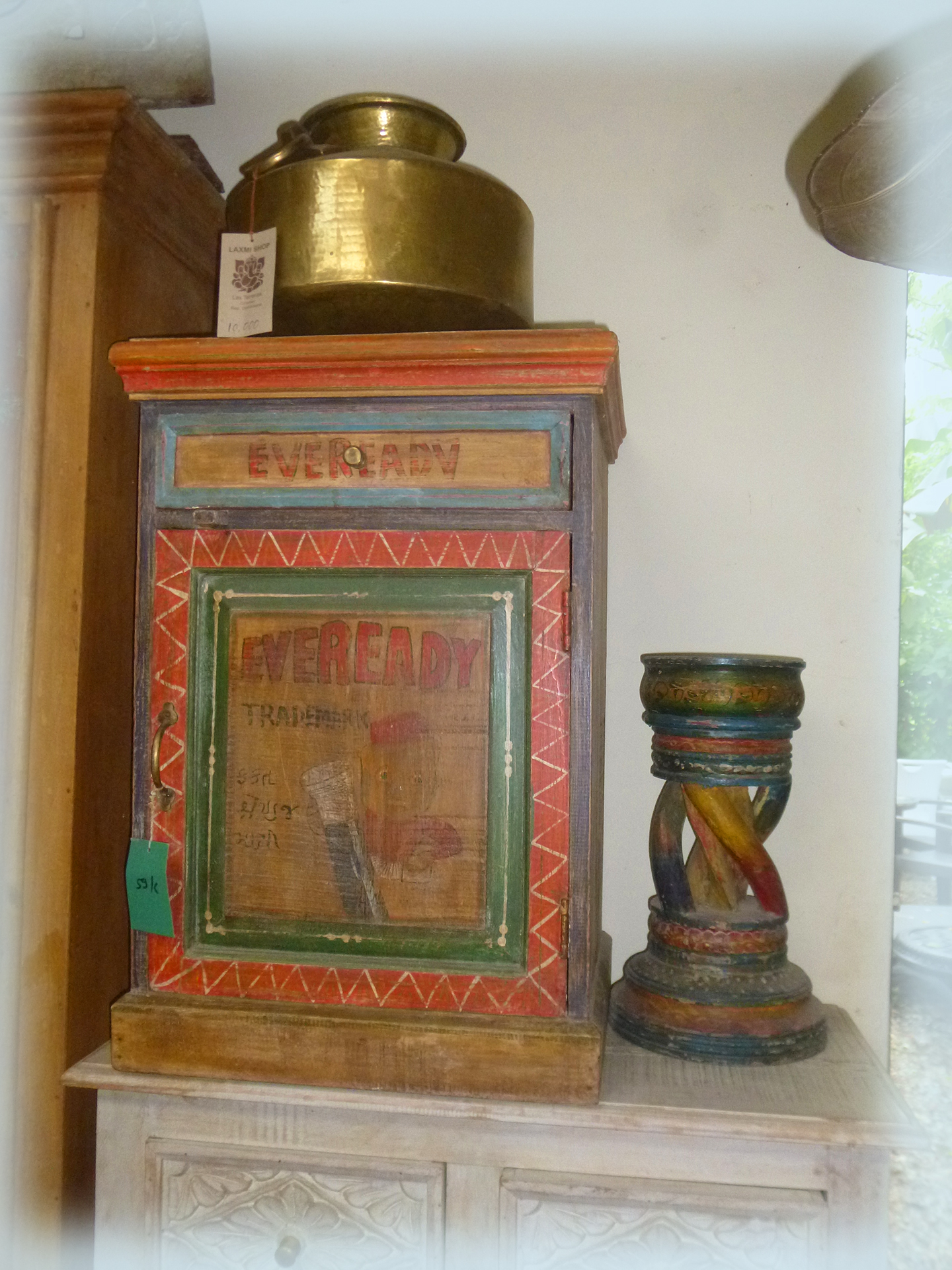 Lits à baldaquins, portes sculptées, bureaux, tables de nuit trop mignonnes chaussées d’escarpins roses, bahuts, chaises, tables. Mais aussi statuettes de divinités indiennes ou de ballerines indonésiennes, bougeoirs dorés, lustres à pampilles, miroirs, lanternes, boîtes émaillées pour enfermer vos précieuses épices, photophores en métal, tapis, abat-jours découpés, bols et récipients ultra-colorés, bijoux de pacotille (ravissants!!!!) de Goa, en verre, nacre, coquillage : la liste est longue, presque infinie, des accessoires qui, posés un peu partout, vont créer une ambiance unique, associés à des tissus à profusion, en soie, des cotonnades ou du cachemire.