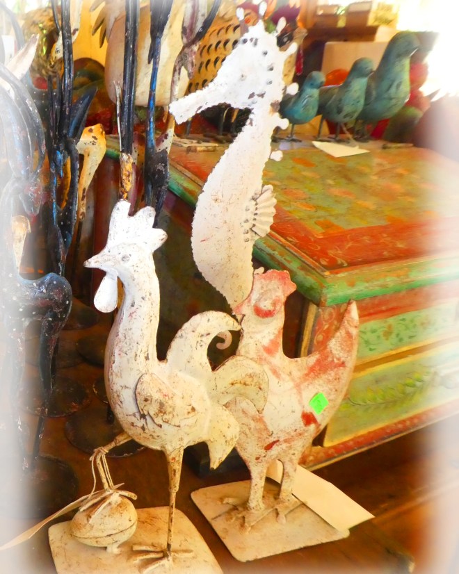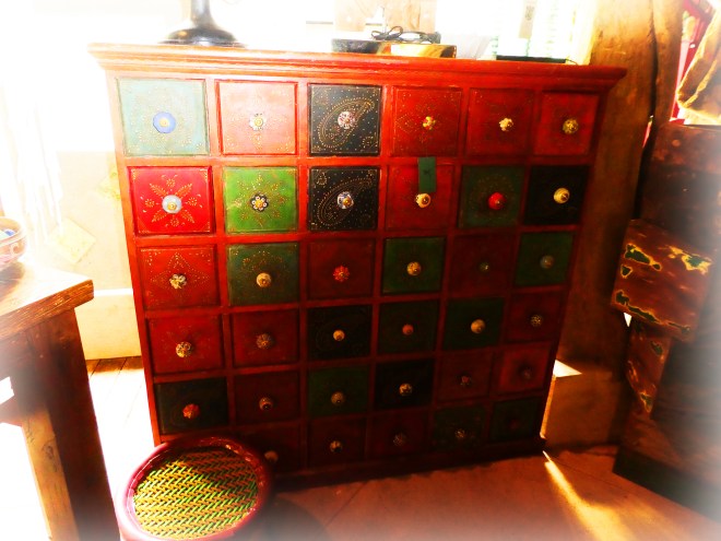 Elle revient à peine de son long périple de près de 2 mois en Inde, le container aux merveilles est arrivé, déballé et tant bien que mal, toutes les trouvailles de José se sont trouvés une petite place dans sa grotte magique. Certes, on ne peut pas dire qu’un ordre académique gère l’endroit, ici c’est à la bonne franquette, un délicieux fouillis où l’oeil vagabonde de haut en bas de gauche à droite, dessus, dessous. Tout est beau, j’aime tout.