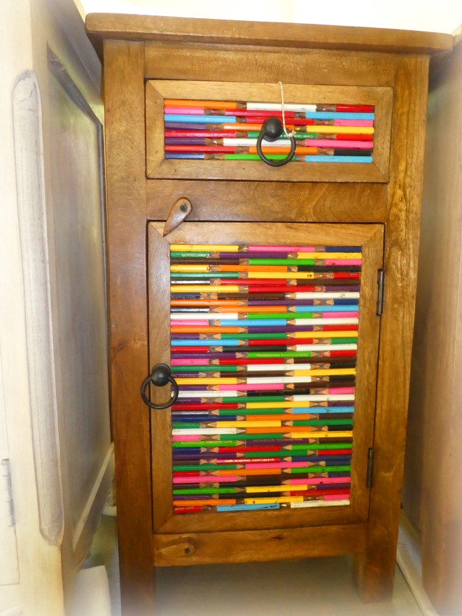 L’artiste peaufine son oeuvre, les escarpins roses et les collants à damiers qui supporteront l’excentrique table de nuit…. (photo Josée B)