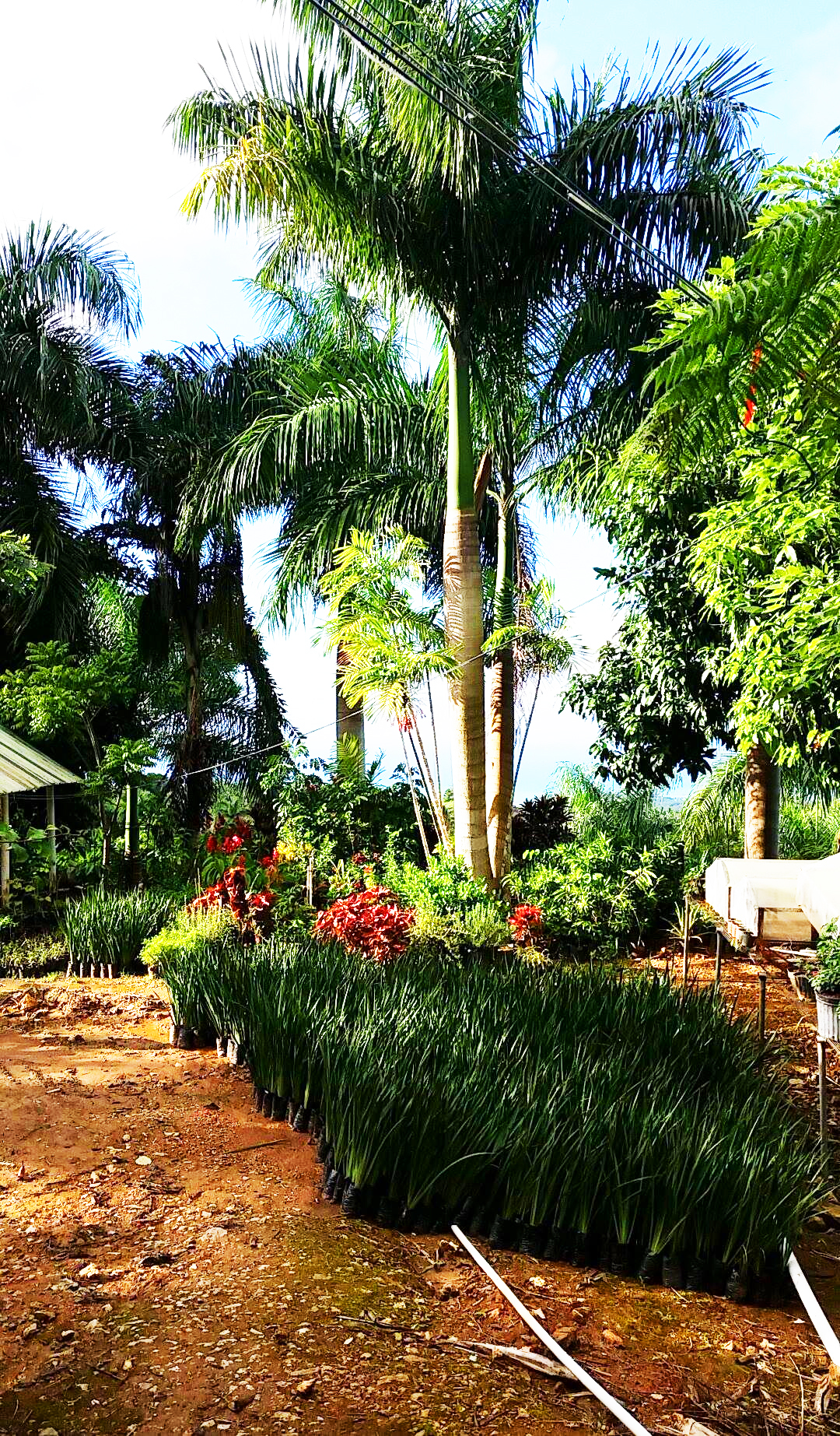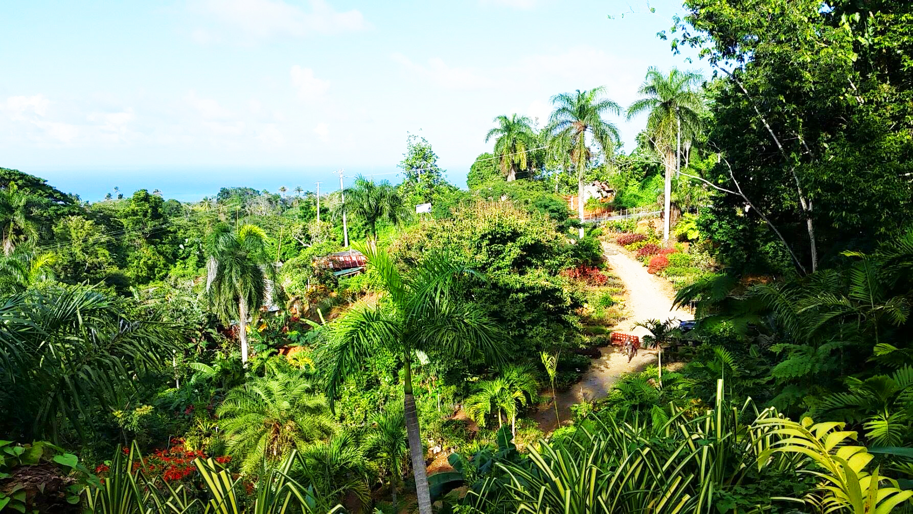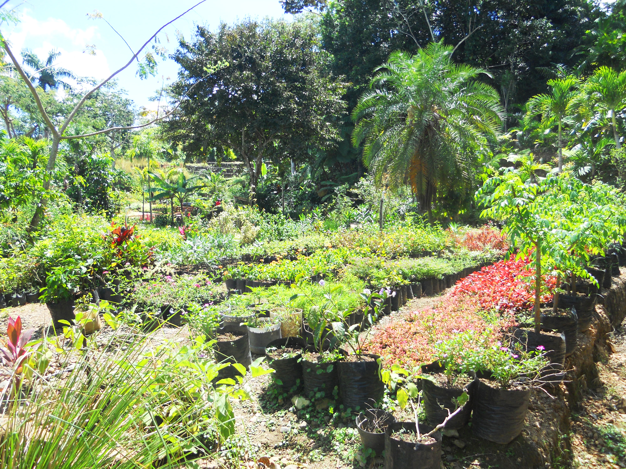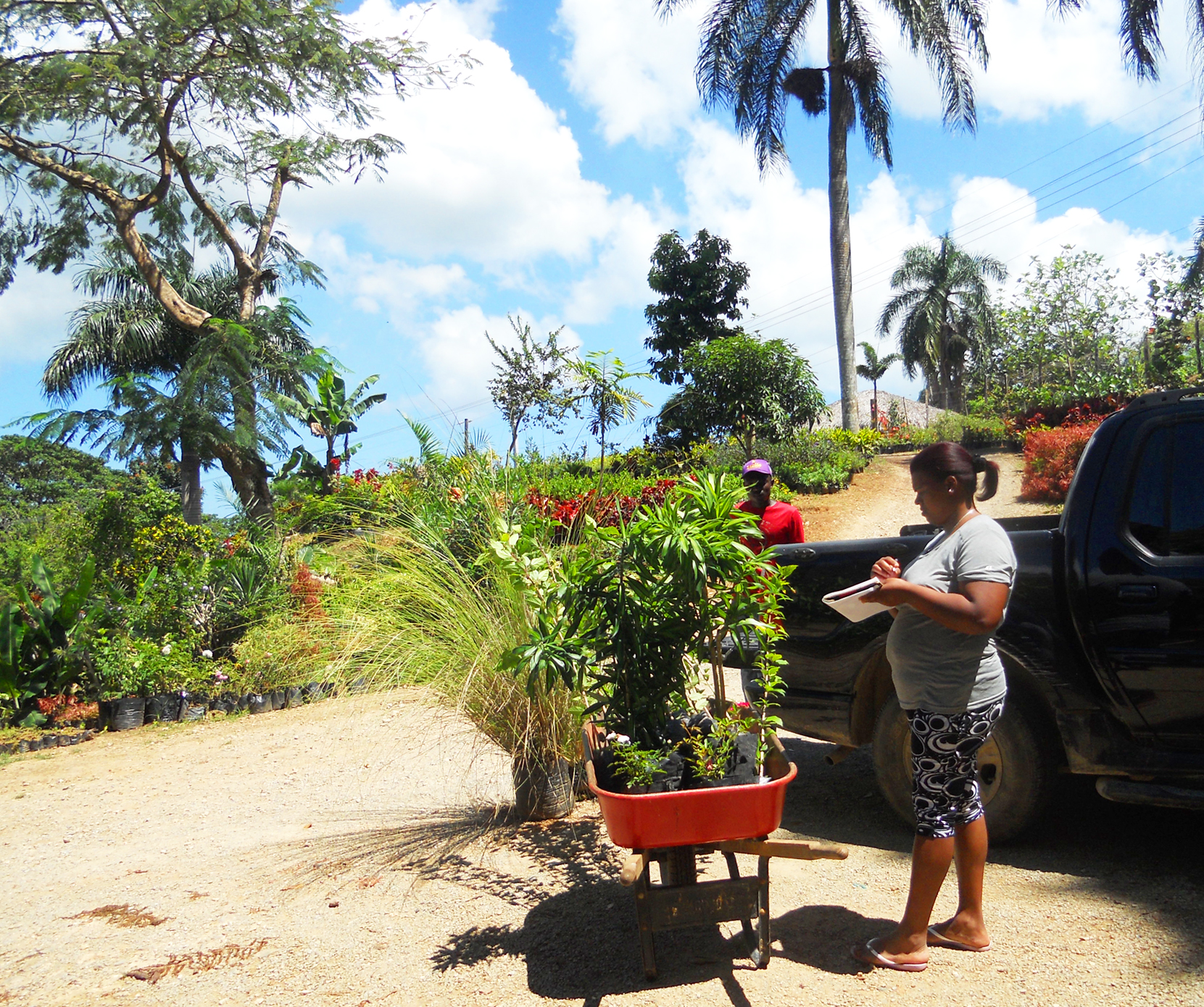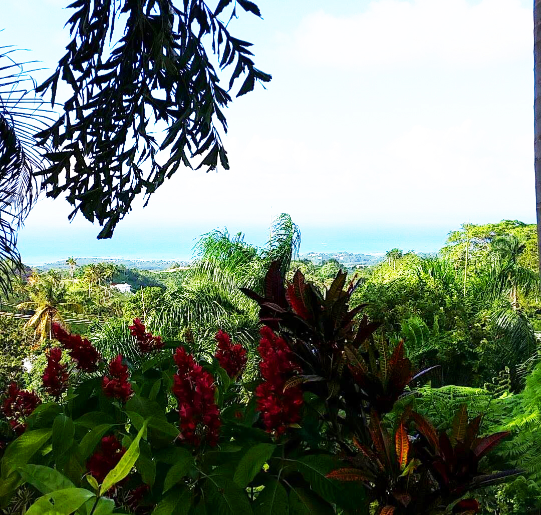 Et nous voilà parties en balade, sur une route merveilleuse. La jardinerie de Los Puentes existe depuis une vingtaine d’années, situées avant le hameau de Los Puentes, elle s’étend sur plusieurs hectares d’un terrain escarpé qui jouit, tout en haut d’une vue à couper le souffle. C’est Estelle Maria, la jolie propriétaire qui nous accueille, son mari est sur un chantier, mais Astrid, habituée des lieux, la rassure bien vite, on va se débrouiller toute seules avec l’aide cependant d’un jeune employé et de sa brouette. Le chemin est tout pourri mais le paysage grandiose, composé de camaieux de verts épousant un camaieu de bleu de ciel et d’océan. Magnifique avec comme seul bruit de fond le chant de centaines d’oiseaux. Le choix est vaste et varié, en petits pots, grands pots ou plantées en pleine terre toutes les plantes exotiques s’offrent à ma convoitise. Il y a les palmes bien sûr, les fougères arborescentes cachées bien à l’ombre d’arbres gigantesques, les fougères classiques, les patchoulis vaporeux, les hibiscus, bougainvilliers, lauriers roses, les lianes comme le ravissant clérodendron et ses délicieuses clochettes blanches et rouges. Puis il y a les plantes fleuries, le magnifique thunbergie aux délicates fleurs violettes, le dentellaire ou plombago couleurs myosotis, les belles heliconies aux longues fleurs tombantes, les gingers, les crinoles, les frangipaniers odorants, les alamandas et même de précieuses petites roses.