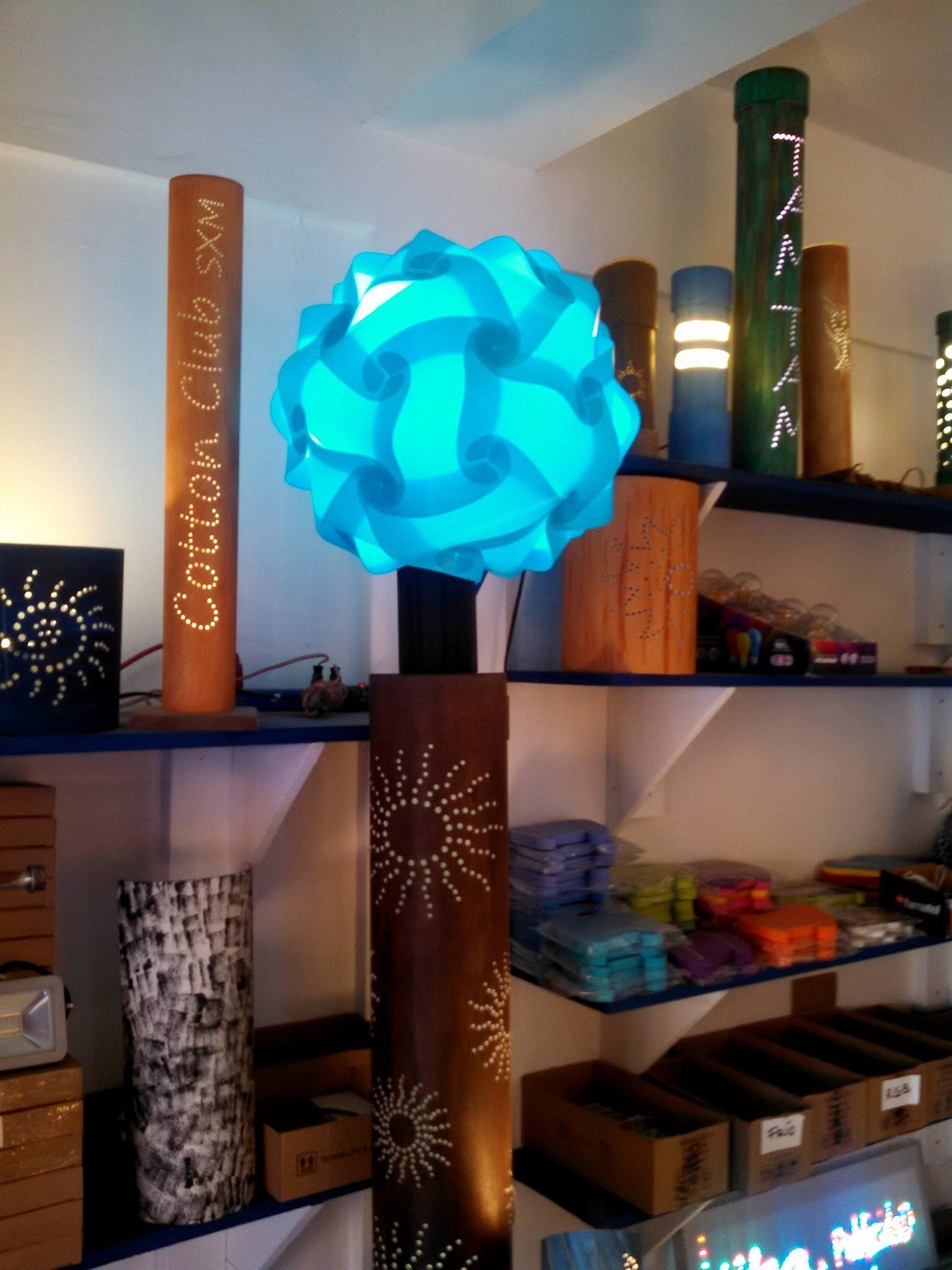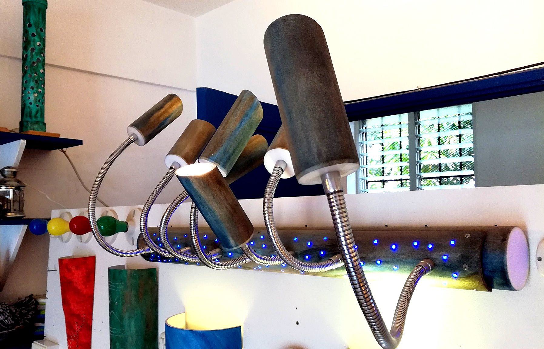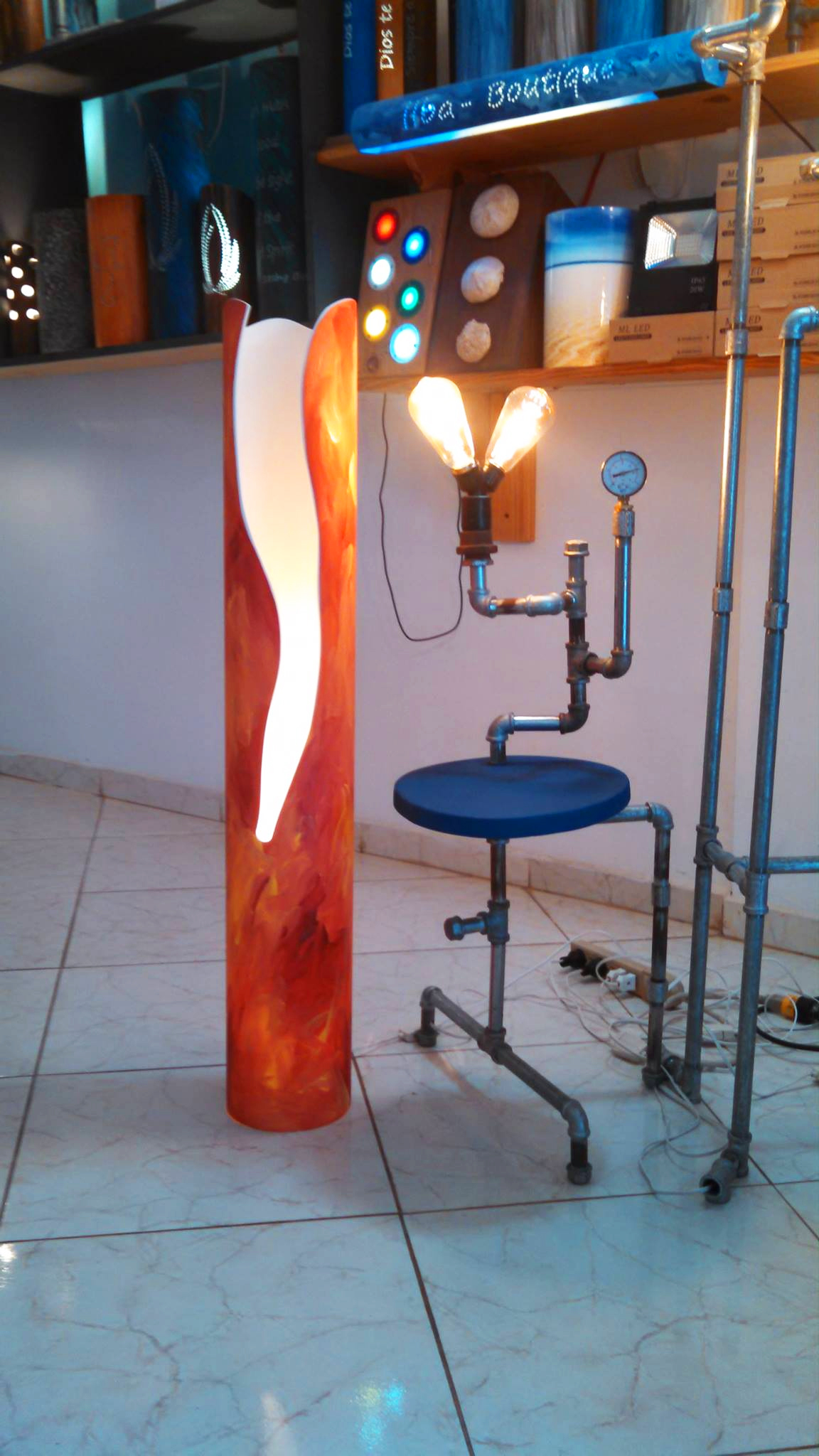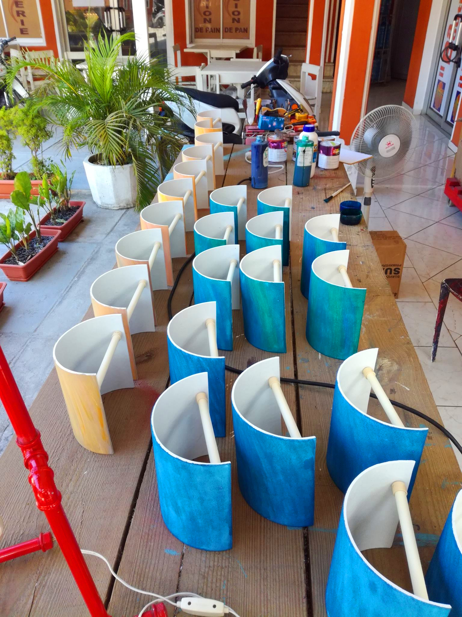 Plaza Italia, une belle boutique aux allures de show-room aux murs tapissés de jolies créations multicolores sages ou fofolles et, juste devant, sur le pas de la porte, un atelier en plein air où s’affaire infatigablement un personnage très inspiré. Les lunettes sur le bout du nez, Gérard, du matin au soir ou presque est plongé dans sa bulle créatrice. Depuis 5 ans, ce touche à tout insatiable imagine, dessine, façonne, découpe, perce, peint, teinte des dizaines de luminaires alliant les qualités de l’artisanat traditionnel au design contemporain. A l’affût d’inventivité et de formes nouvelles, il travaille seul et réalise à la main, à l’aide d’une perceuse, d’une ponceuse et d’une scie à guillotine une collection exclusive de luminaires personnalisés qu’il se plait à faire évoluer au fil de ses émotions. Son matériau de prédilection, le PVC, inoxydable et sûr lorsqu’il épouse les ampoules LED. Mais, notre créateur n’hésite pas à s’échapper de sa zone de confort pour réaliser de belles suspensions aériennes en polypropylène, des lampes futuristes en tubes galvanisés, en flexibles rigides ou même…. en grillage de lapin…. Il y en a pour tous les goûts, de toutes les envergures, de toutes les hauteurs et de toutes les couleurs déposées harmonieusement au pinceau, à l’éponge ou au doigt. Suspensions, appliques, lampes à poser, veilleuses, chaque modèle est unique, créé sur mesure. La douce lumière tamisée d’une ampoule LED, confortable, écologique, économique et de très longue durée se diffuse délicatement au travers de ces créations atypiques mais très fonctionnelles.