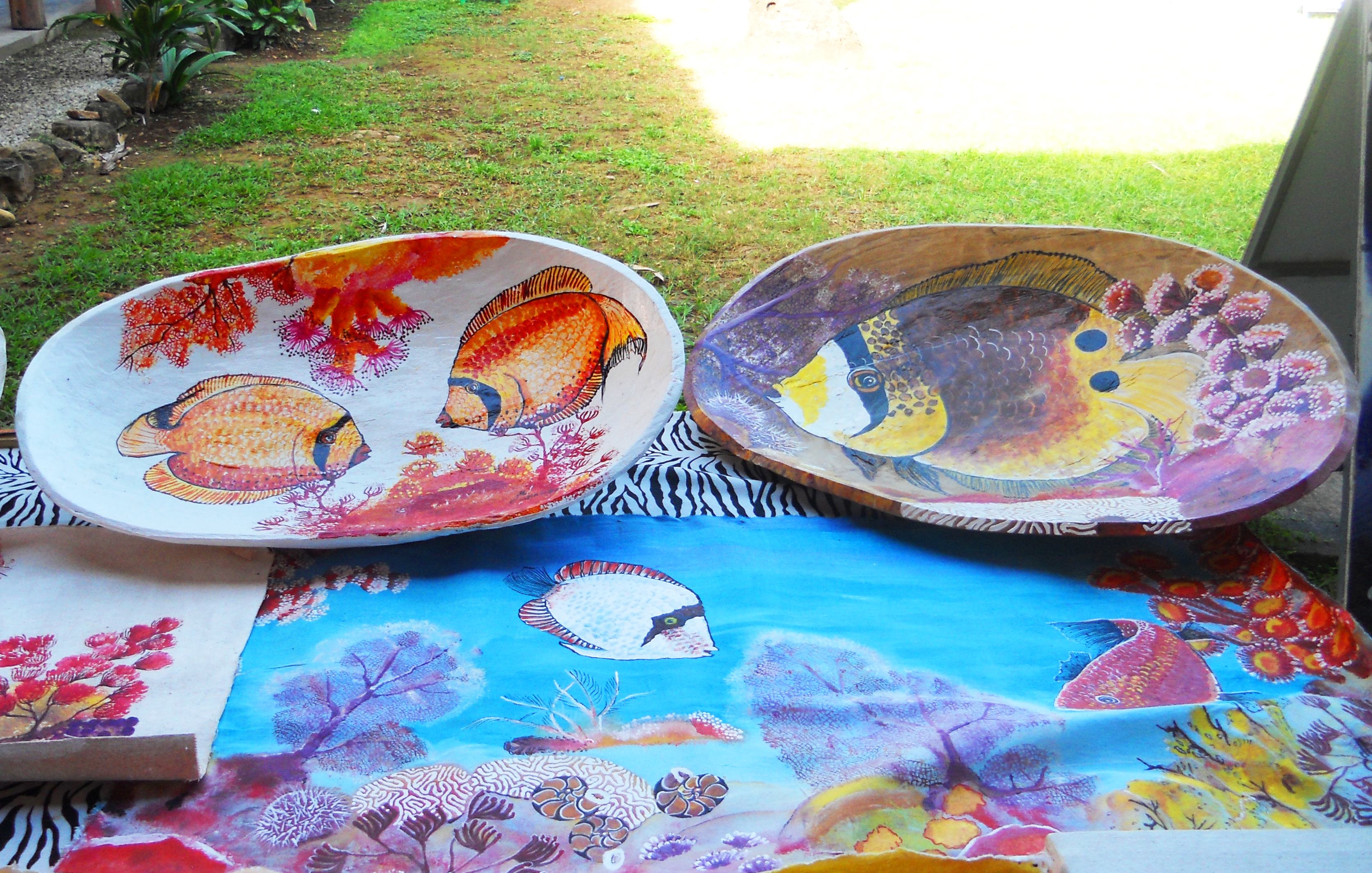 Une belle sensibilité se cache sous le dynamisme débordant de cette jolie jeune femme, une « ancienne » de Las Terrenas. Décoratrice talentueuse à ses heures, en semaine, elle s’occupe de la Galerie Née du Paseo et ca lui va comme un gant, le samedi, elle profite de l’opportunité du Marché pour exposer quelques-unes de ses oeuvres, juste en face de la galerie. Le monde de Marie, c’est la mer, les poissons multicolores, les coraux, les fonds marins, une vraie passion d’artiste. Son univers, elle le peint sur des toiles, bien sûr, mais aussi sur des plateaux de bois de caoba, petits ou grands, chics et hyper légers (c’était le bois de prédilection des pêcheurs Tainos pour leurs embarcations rapides et légères) , dans des coloris acidulés ou de subtiles teintes pastel. Les poissons s’animent et nous observent derrière de délicats coraux. Mais au fait, vous la connaissez Marie, c’est elle qui s’est imposée la lourde tâche, il y a quelques mois, de redécorer (en compagnie d’Alfredo) les murs du cimetière. Depuis, les poissons s’y donnent à coeur joie, égayant de leurs couleurs lumineuses ces murs au coeur du village, enfermant de tristes secrets.