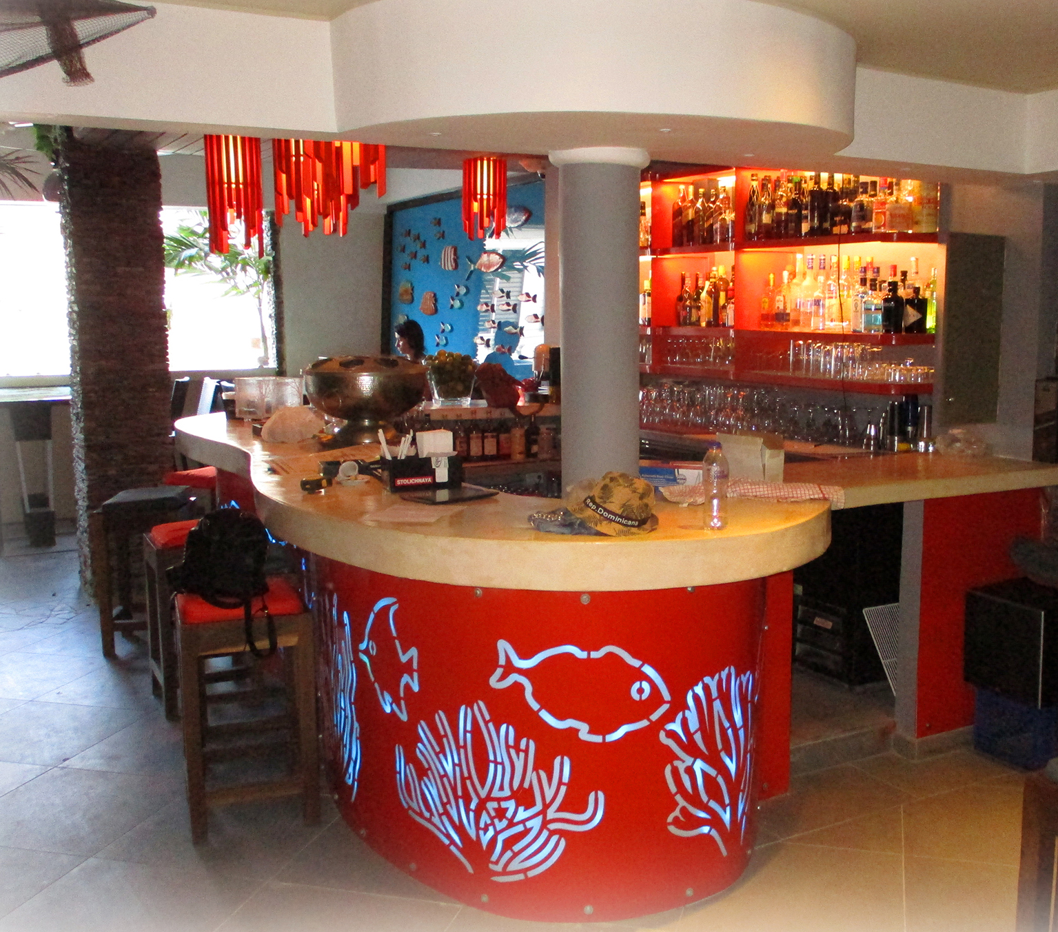 Leurs vacances sont loin d’être terminées et il leur reste encore tout un tas de choses à découvrir mais il faut faire un choix. Alors, ce sera les Haitises avec Nicolas puis une escapade en kayak avec Pinto, boss du Manati Water Sports. En attendant, je leur raconte mes chouchous, Beatrice de Corryb by Mahona, Josée de Laksmi shop, Jordi du Taller de los Flores, Babette et Jean-Paul de Terrenas en Plata. Du coup ils ont hâte de découvrir par leurs propres yeux les stupéfiantes merveilles de ces boutiques très tendance. En attendant, nous nous régalons des succulents petits plats de Sergio dans son adorable resto Sergio B., ludique et largement inspiré par la mer côté déco mais aussi côté assiettes où la cuisine fait la part belle aux précieuses douceurs de l’océan… Le Sergio B est sans conteste un bel endroit bourré de charme et de poésie. Fonds marins réinventés, aquariums géants plus vrais que nature où batifolent une ribambelle de poissons chatoyants, tout droit sortis de l’imaginaire d’artistes locaux. Tout près du ravissant bar à sushis, c’est une cambuse chic qui nous accueille, habillée de bois précieux, hublots rescapés d’un bateau échoué et percée fascinante d’un mur de pierre sur le plus beau des points de vue marin. Autour d’un vocabulaire simple et joyeux, l’humour en prime, la déco particulièrement soignée vous invite à la détente. Le raffinement est partout jusque dans les somptueuses toilettes aux larges fresques signées Alfredo Castillo. Seule ombre triste au tableau, la vue sur ce qui reste de l’ancien Village des Pêcheurs détruit par le feu il y a quelques mois. Un espace-décombre, comme une verrue dans ce paysage paradisiaque.
