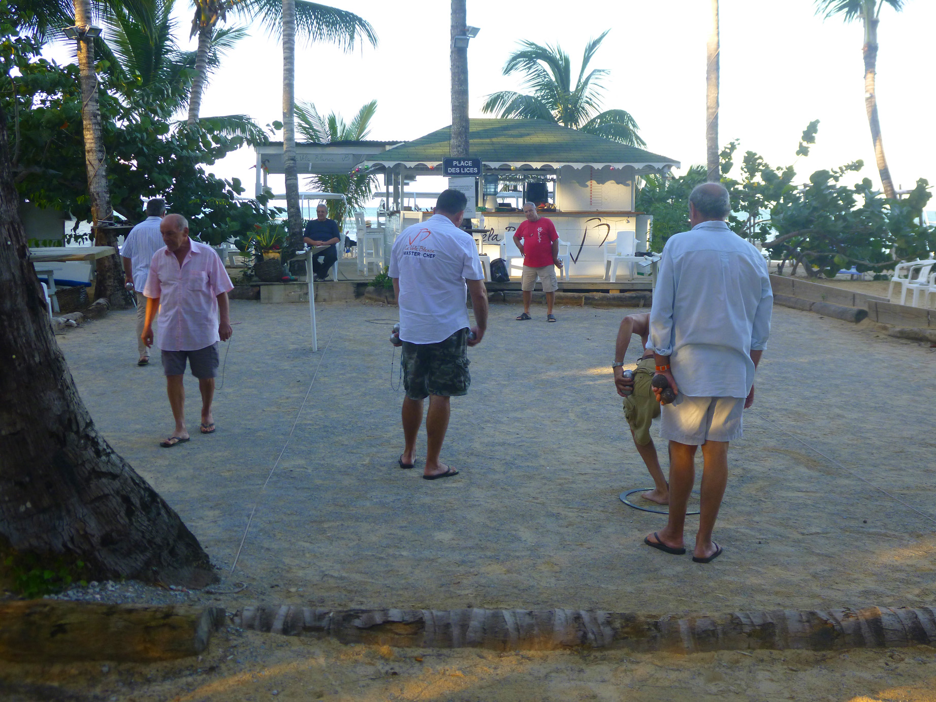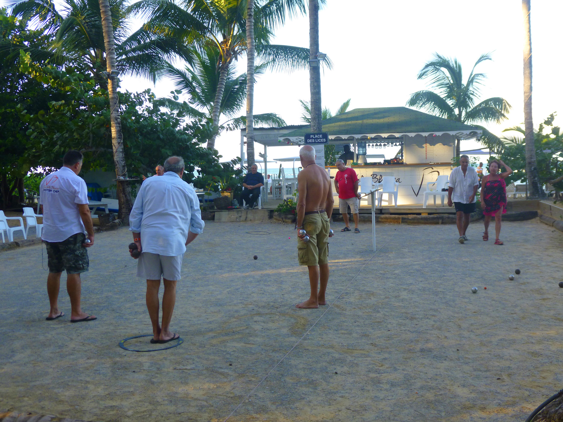 Je disais donc que dès qu’il y a eu des francais à Las terrenas, il y a eu des parties de pétanque. Dans les années 80, les anciens se souviennent encore des tournois mémorables se déroulant sur 2 week-ends, histoire de se refaire une santé entre les deux parties…. si vous voyez ce que je veux dire. L’idée: en partant du Paco Cabana, rejoindre le Tropical Banana en jouant aux boules. Bien sûr, à l’époque, les chemins de terre faisaient office de route, un vaste terrain de jeu pour ces boulistes « du dimanche ». Un tricycle improbable chargé comme un âne bâté de …. rosé accompagnait les joyeux drilles qui, pour corser le tout avaient établi une règle unique, « pas de règle », tous les coups sont permis. Une franche rigolade à défaut d’un jeu bien académique.